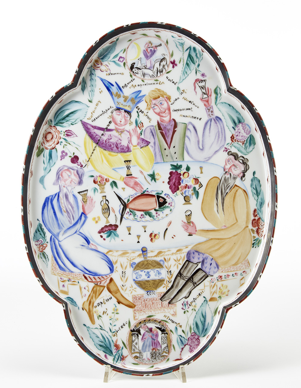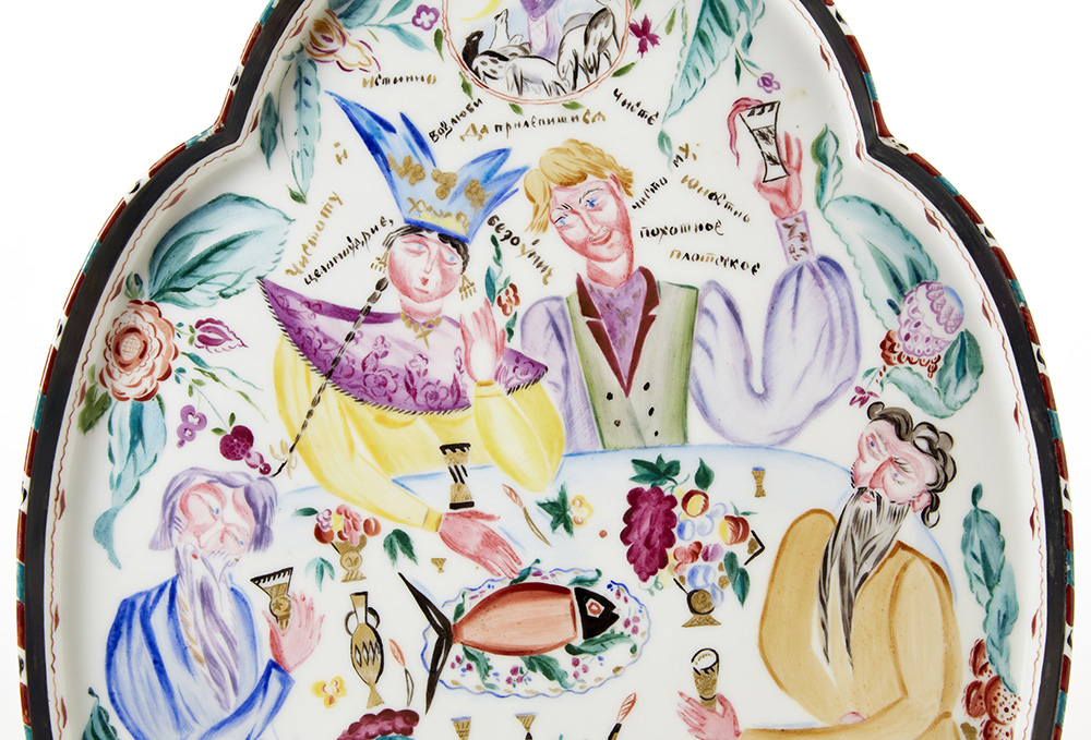 Piatto da portata in porcellana decorata a mano in policromia e oro zecchino con scena raffigurante un banchetto nuziale e iscrizioni evocanti i vizi e le virtù. Ascrivibile al progetto statale propagandistico denominato Agitfarfor (porcellane di agitazione). Manifattura di Stato di Pietrogrado (poi Leningrado), Pietrogrado U.R.S.S. 1921. Marcato e firmato al verso con il monogramma della manifattura di Pietrogrado in verde, il simbolo della falce e martello, il sole nascente, la data 1921 e la firma del decoratore.