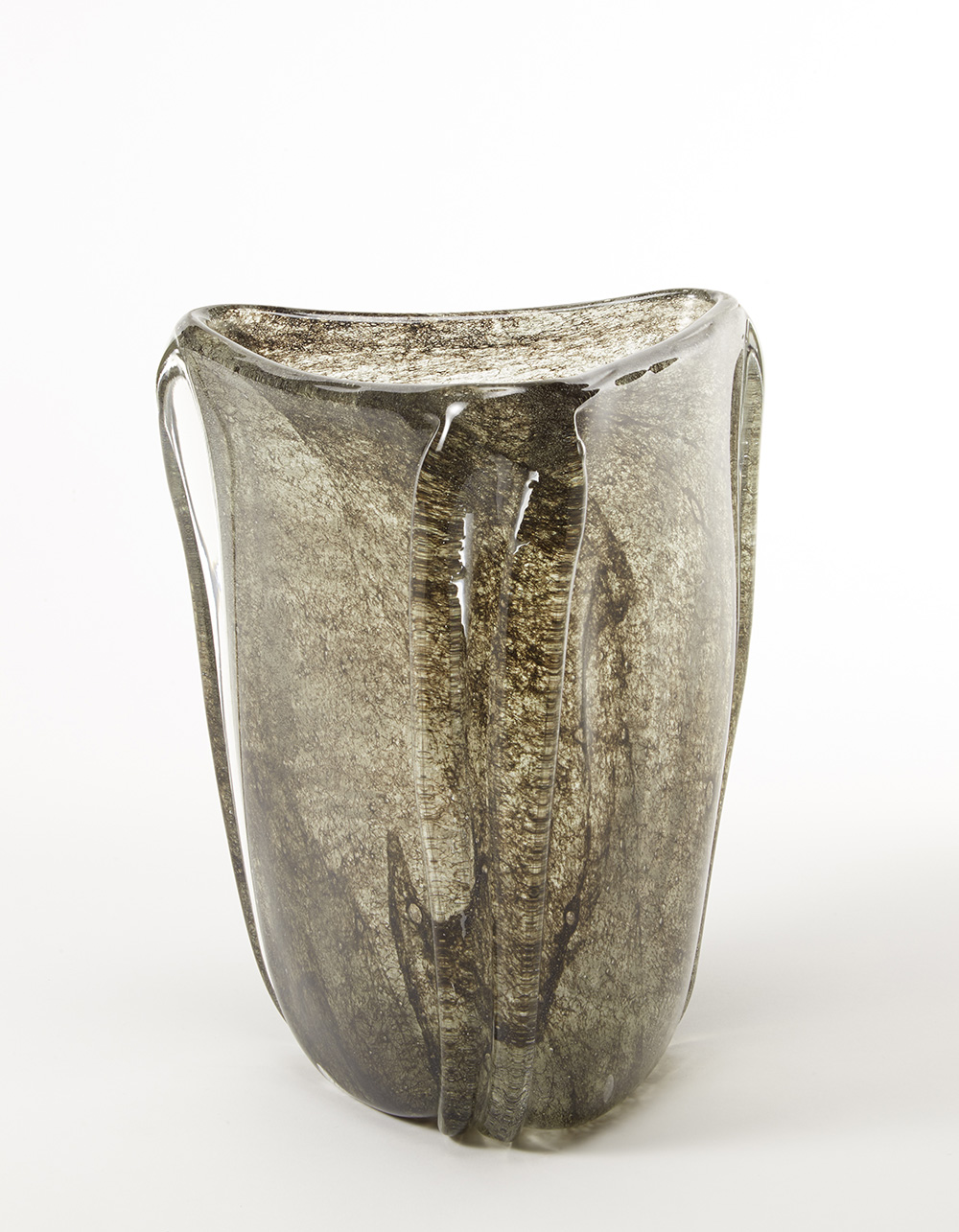 Vaso a sezione triangolare e a spigoli costolati della serie "Crepuscolo". Manifattura Ferro Toso Barovier, Murano, 1935/1936. Vetro soffiato incolore trasparente con inclusione di bolle e di filamenti metallici senza fusione. (h cm 31,5) (lievi difetti)