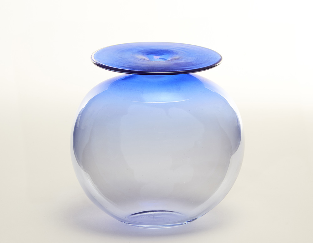 Vaso soliflore in vetro soffiato trasparente blu sfumato e iridato sulla superficie esterna. Prototipo della serie "Variante". Esecuzione Vetreria Galliano Ferro, Murano, 1956. Firmato e datato sotto la base. (cm 21,6x21,3x16)