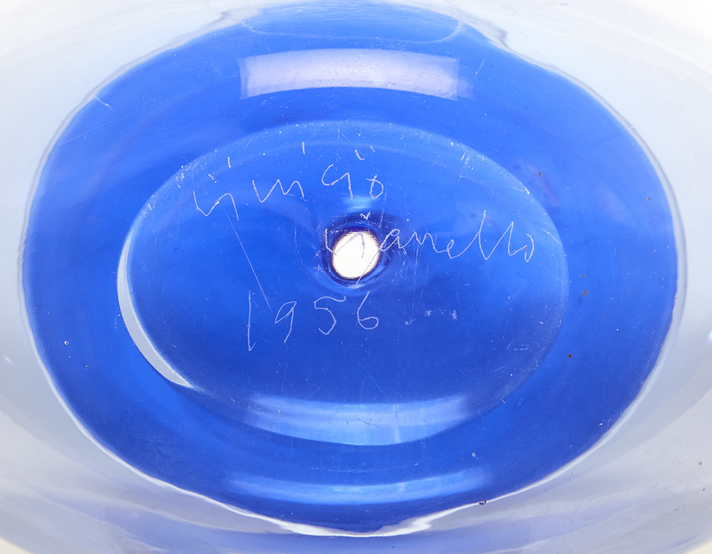Soliflore vase in blown blue transparent glass, shaded and iridescent on the external surface. Prototype of the "Variante" series. Execution by Vetreria Galliano Ferro, Murano, 1956. Signed and dated under the base. (21.6x21.3x16 cm.)