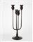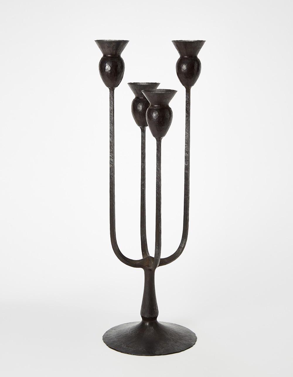 Candelabro in ferro battuto a quattro braccia diramate da fusto centrale con base circolare e terminanti in portacandela a forma di boccioli. Roma, 1944. Firmato a incussione sulla base "GERARDI" e datato 1944. (h cm 60)