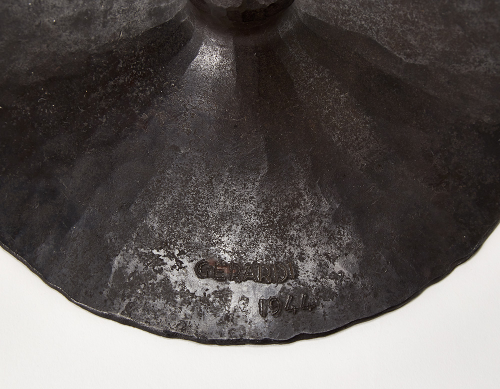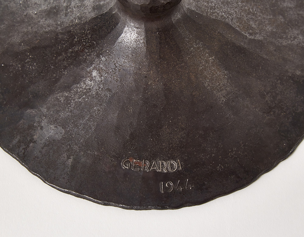 sull'autore: G. U. Arata, Ferri battuti e ferri sbalzati di A. Gerardi, Edizioni della Galleria Pesaro, s.d. ma 1923; C. Maltese, Alberto Gerardi, De Luca editore, Roma 1964; Alberto Gerardi, catalogo della mostra a cura di R. Zuccaro, De Luca Editori d’Arte, Roma 2008; I. de Guttry, M. P. Maino, Metalli liberty e déco, Collana Antiquariato del ‘900, 24 ore cultura, Pero (Mi) 2013