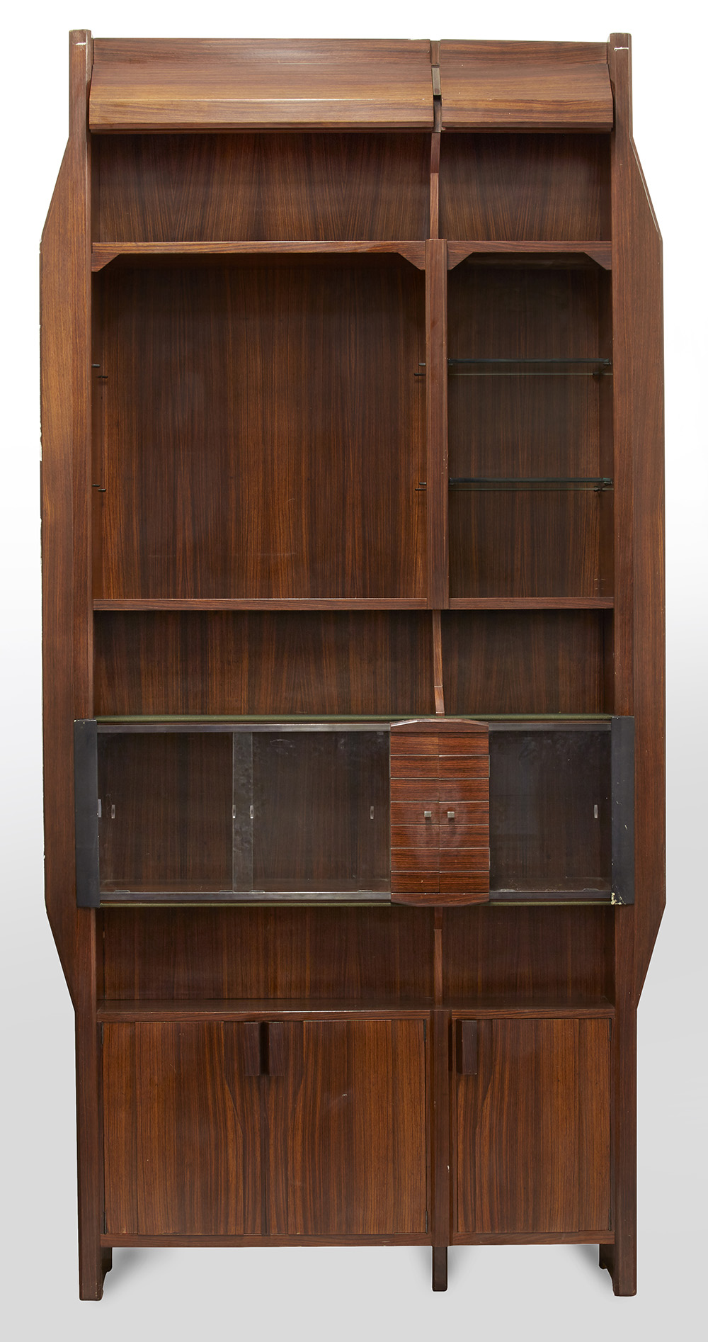 Libreria da incasso in massello di palissandro indiano, con tre stipi ad ante nella parte bassa, una vetrina centrale ad ante scorrevoli e tabernacolo, ripiani a giorno in legno e vetro. Italia, anni '60. (cm 142x288x43) (lievi difetti e mancanze)