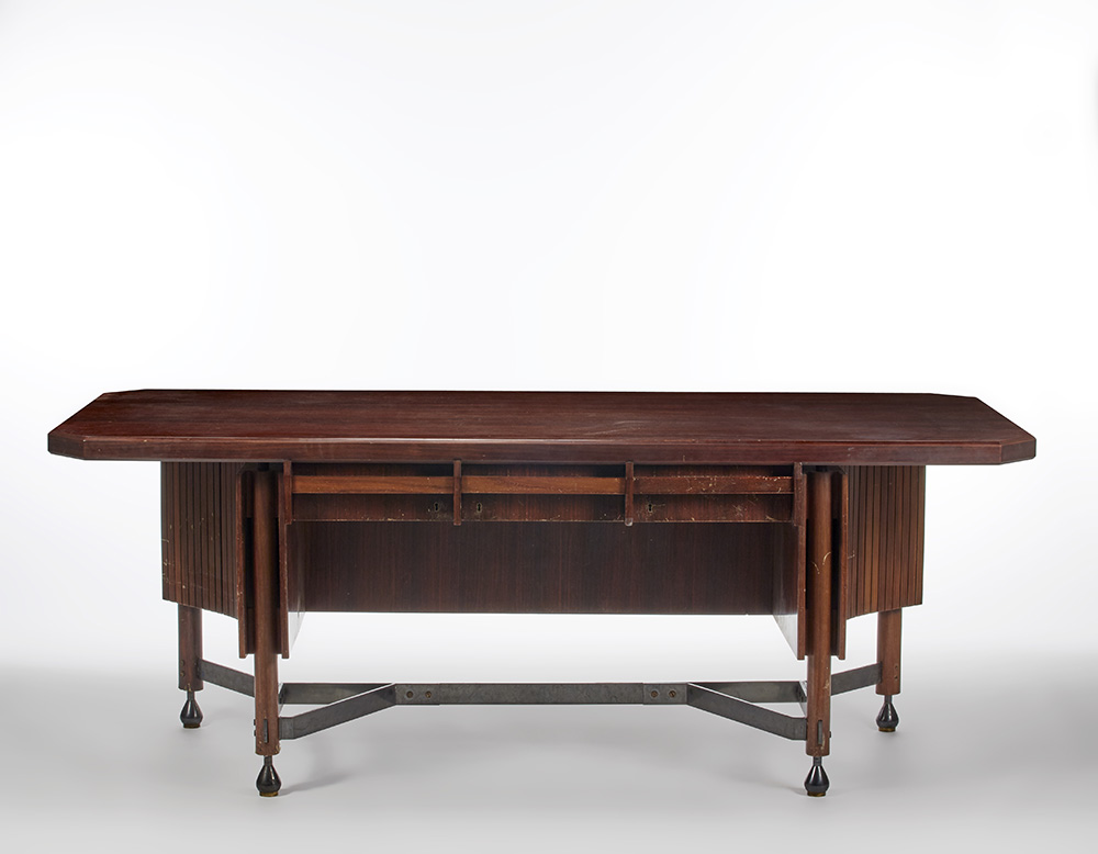Scrivania in legno di palissandro indiano massello, bordato e impiallacciato, con tre cassetti sottopiano, fronte e fianchi schermati in legno a piccole doghe, quattro gambe in legno massello unite da correnti in piattina di ottone brunito. Piedi a cipolla in fusione di metallo brunita. Italia, anni '60. (cm 209x78x90) (lievi difetti)