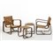 Coppia di poltrone con sgabelli. Produzione Gino Maggioni, Milano, anni '40. Struttura in legno multistrato curvato e legno massello, seduta e schienale in corda intrecciata. Modelli disegnati per l'Universitá Commerciale Luigi Bocconi. (poltrone: cm 61x74x69,5; sgabelli: cm 40x42,5x45) (difetti)
