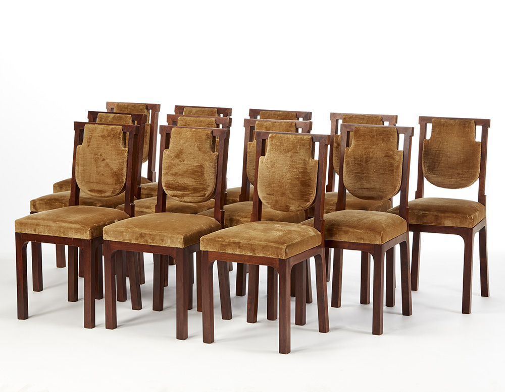 Gruppo di dodici sedie modello "Fiera di Trieste". Produzione Moscatelli, Cantù, anni '60. Struttura in legno massello rivestimento in velluto beige. (cm 42x89x47,7)