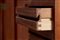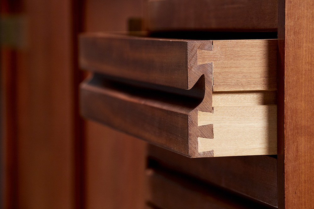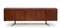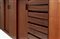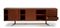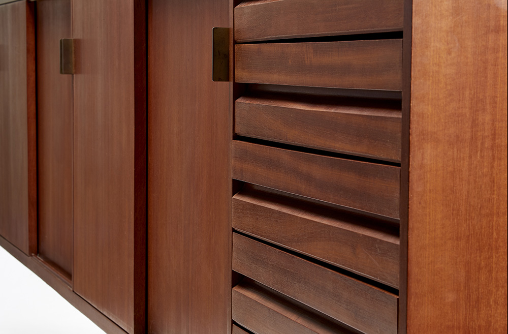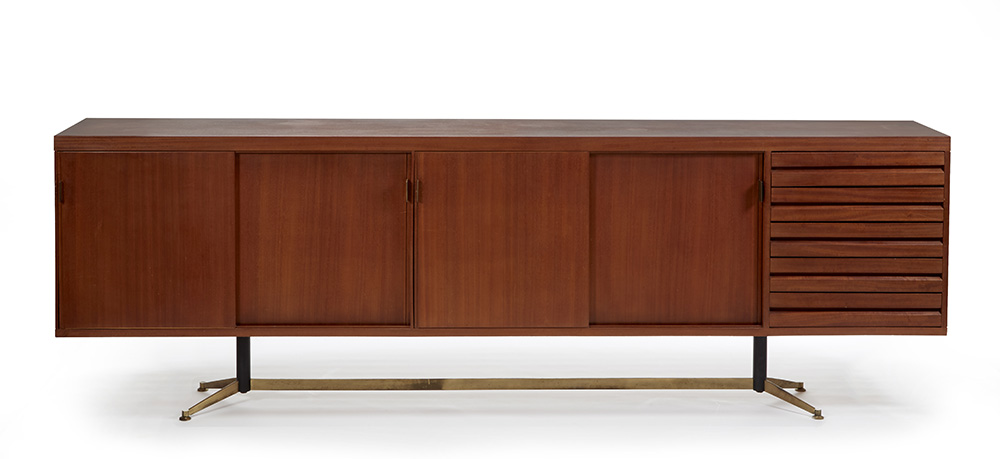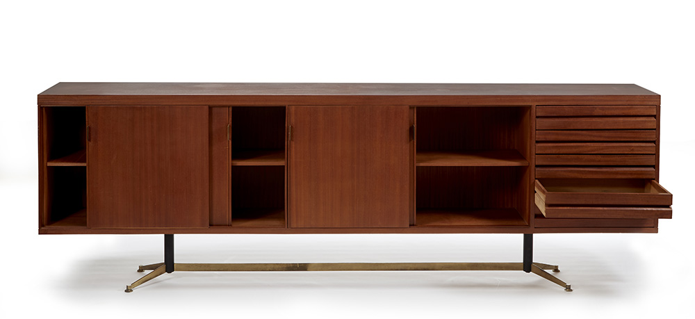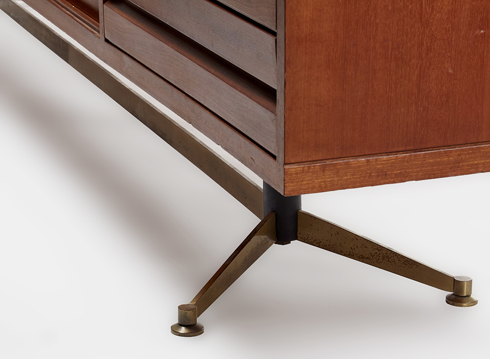 Mobile contenitore a quattro scomparti con ante scorrevoli e uno a cinque cassetti. Esecuzione Piero Frigerio, Cantù, anni '50. Legno impiallacciato e massello di Teak, traliccio di base in ferro verniciato nero e ottone, piedini regolabili.