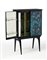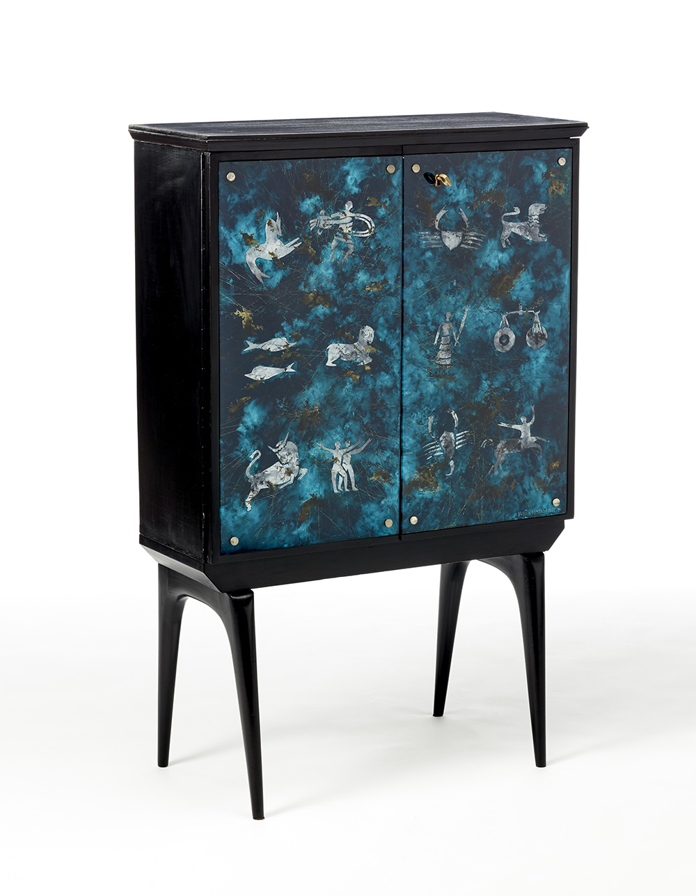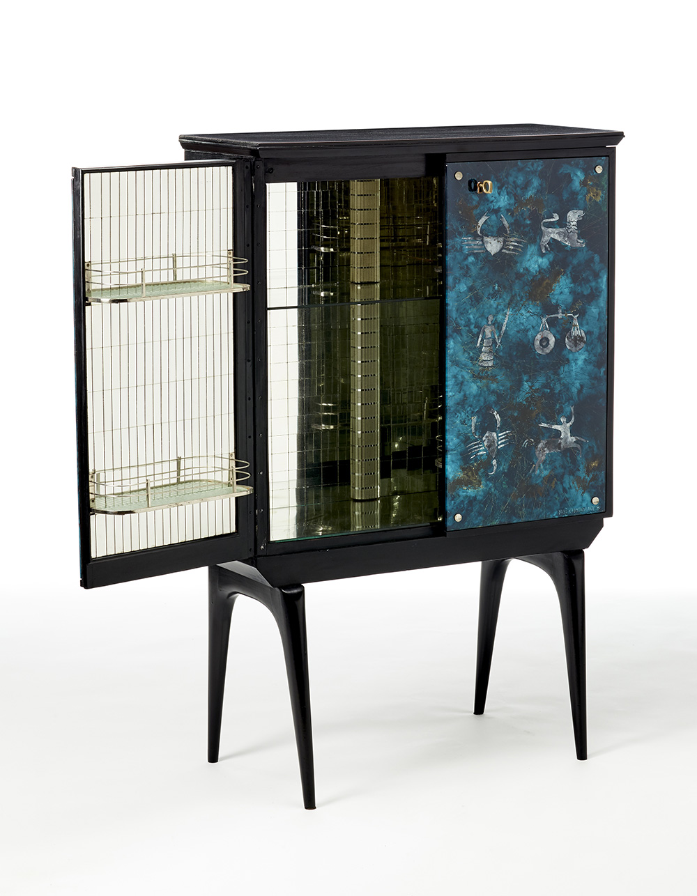 Mobile bar a due ante. Produzione Fontana Arte, Milano, anni '60. Legno ebanizzato, cristallo retro dipinto con i segni dello zodiaco firmato in basso a destra "DUBE'*FONTANA ARTE*". Interni in tessere di vetro specchiato e metallo nichelato. (cm 79,5x124,5x31,5) (lievi difetti, restauri e piccole mancanze)