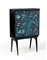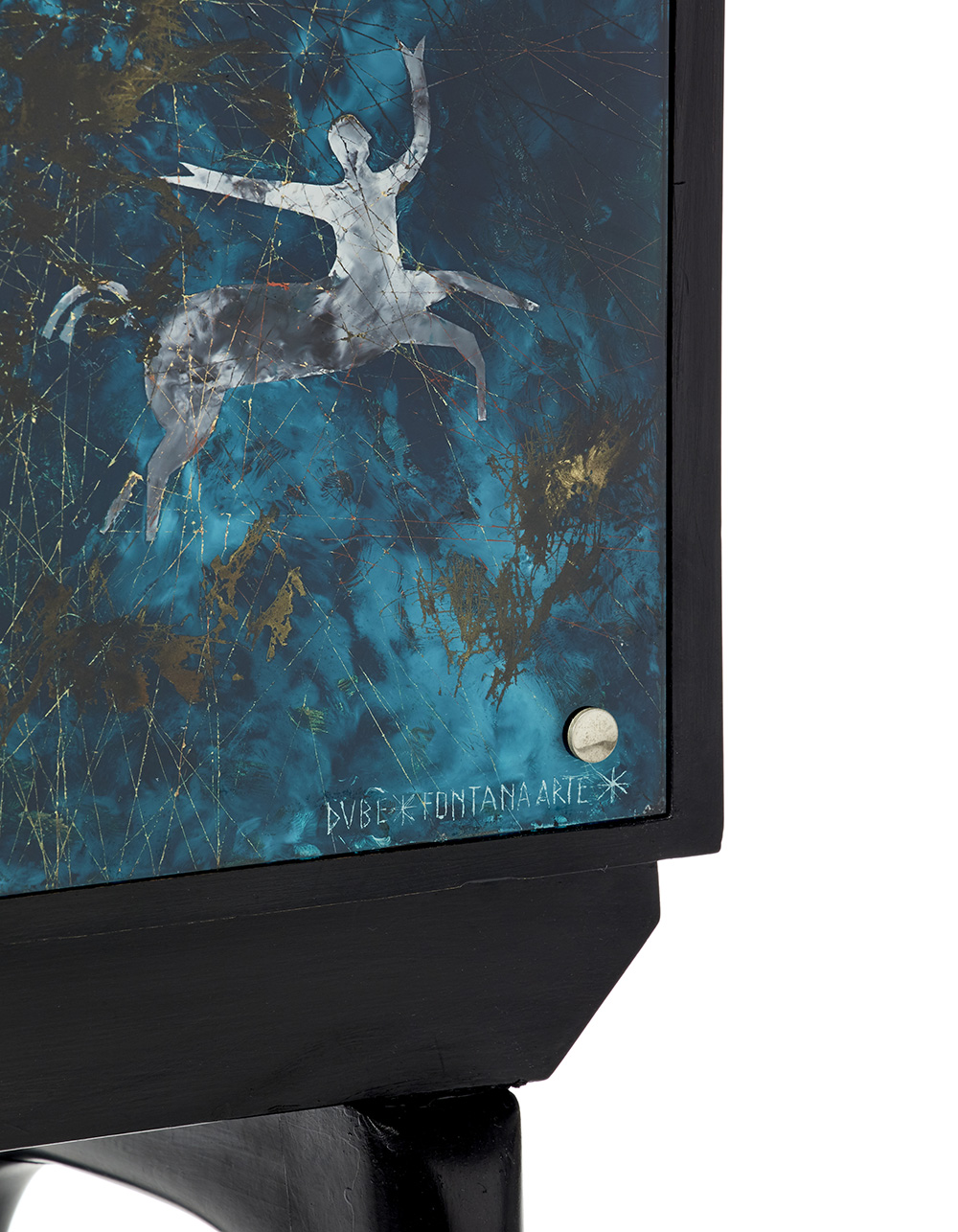 Two-door cabinet bar. Produced by Fontana Arte, Milan, 1960s. Ebonized wood, retro crystal painted with the signs of the zodiac signed in the lower right corner "DUBE '* FONTANA ARTE *". Interior in mirrored glass tesserae and nickel-plated metal. (79.5x124.5x31.5 cm.) (slight defects, minor restoration and minor losses)