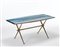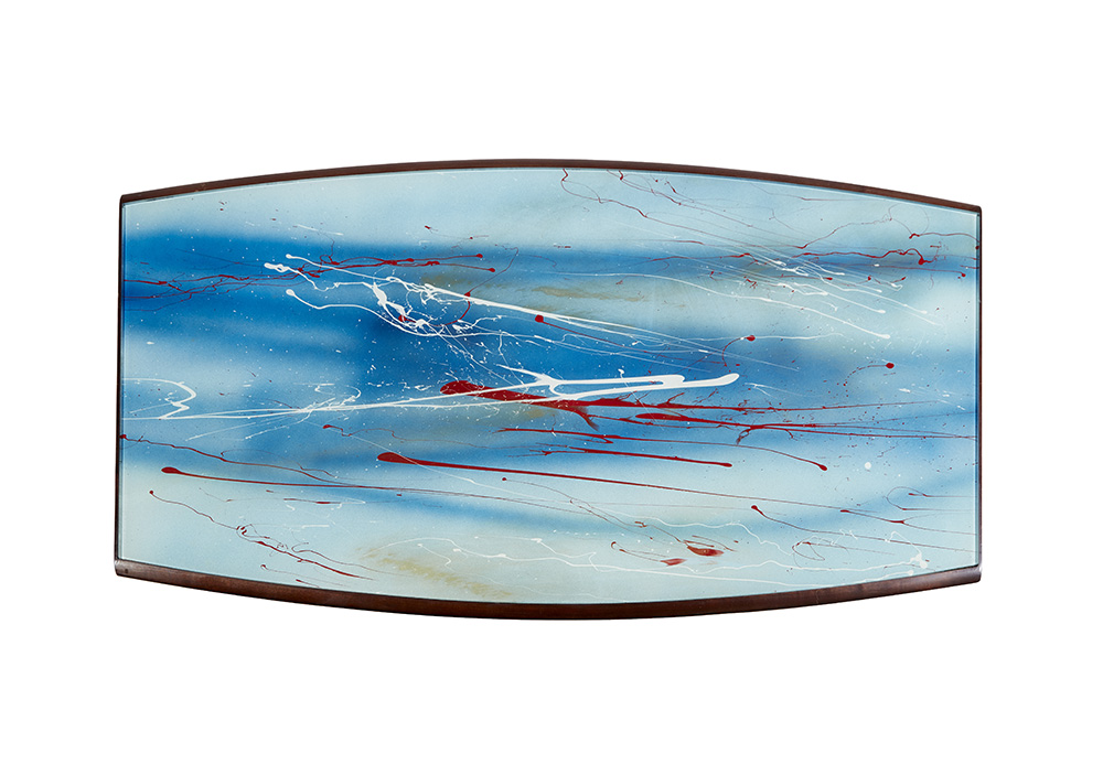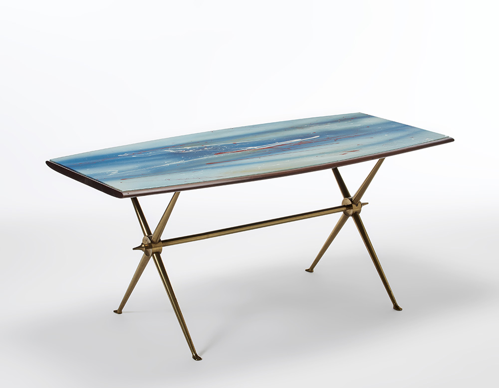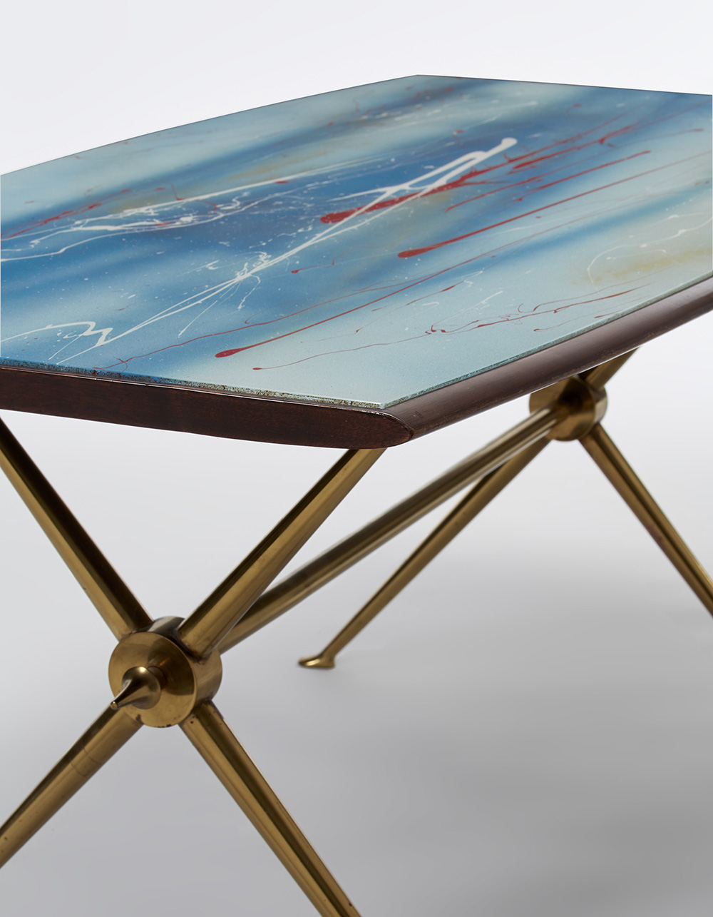 Tavolo basso con piano a losanga. Esecuzione Arredamenti Borsani Varedo, 1953. Struttura in ottone lucidato, piano in legno massello inquadrante piano in cristallo retroverniciato con composizione della serie "concetto spaziale", concepita e sviluppata da Borsani con Lucio Fontana. (cm 110,5x51x60)