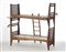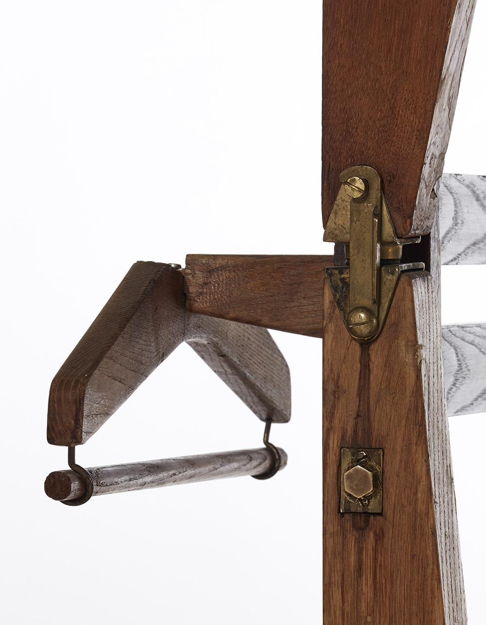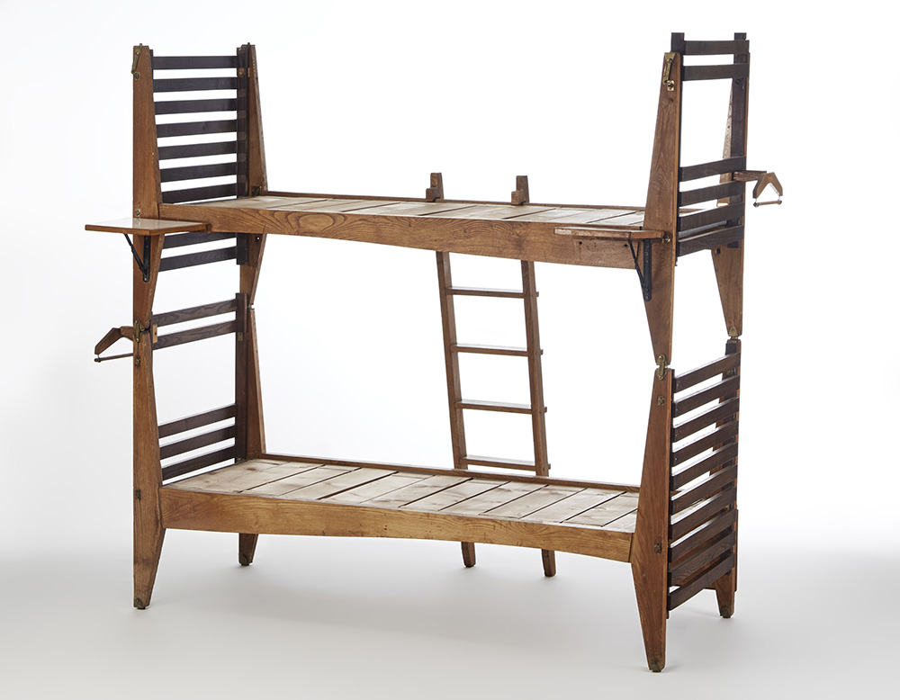Coppia di letti singoli sovrapponibili della "Casa del Sole" di Cervinia. Esecuzione Ettore Canali, Brescia, 1955ca. Legno di rovere massello, ottone, piani dei ripiani a ribalta in formica bianca. Configurati con due piani a ribalta pensili e due appendiabiti mobili. (letto singolo: cm 195x106x85; h tot letti sovrapposti: cm 205; sporgenza appendiabiti: cm 10,5; dimensioni piano pieghevole: cm 32,5x30,5) (difetti)