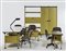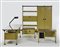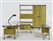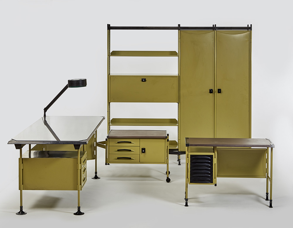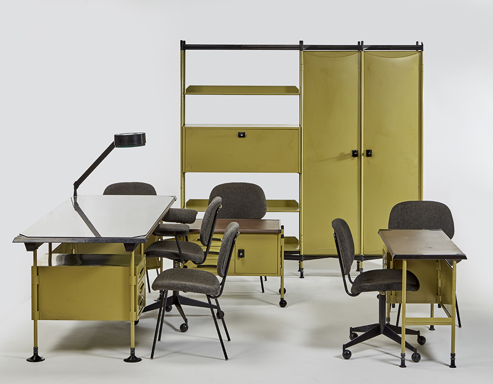 Arredamento completo per ufficio della serie "Spazio" composto da: una scrivania piccola per dattilografa, una scrivania grande con cassettiera, una libreria a giorno con stipo, un armadio, una lampada da tavolo, quattro sedie e due poltroncine. Produzione Olivetti Arredamenti Metallici, Ivrea, anni '50. Ferro laccato in verde e nero, piedini e bordure in plastica, piani rivestiti in similpelle marrone, sedie rivestite in tessuto grigio. (Scrivania per dattilografa cm: 94,5x68,5x44,5; scrivania grande cm:195x78,5x78,5; libreria cm:52x199x31; armadio cm:203x199x32; lampada cm: h max 57, d 23; sedie cm:50x80x55; poltoncine cm:79x87x55) (lievi difetti)