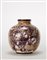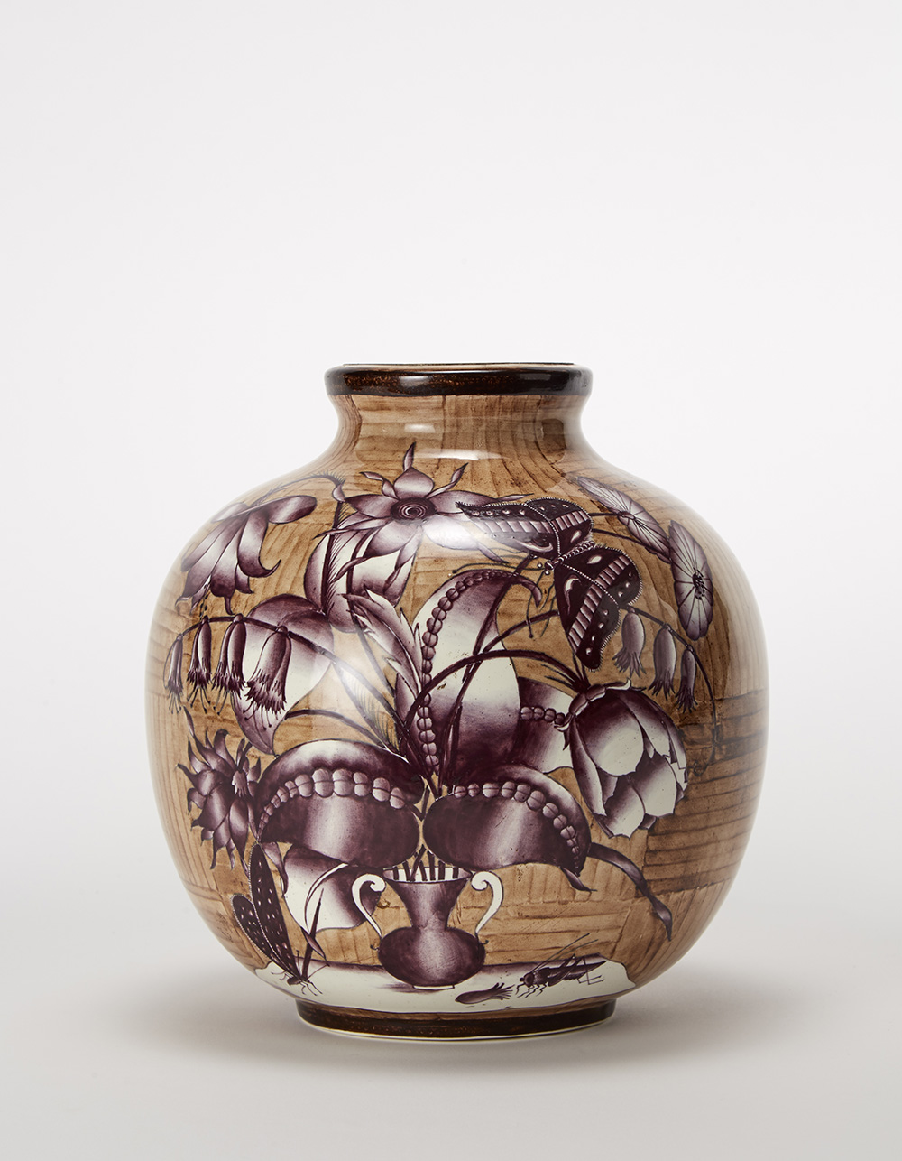 Vaso montato a lampada in terraglia forte smaltata in policromia sotto vetrina con soggetto a fiori e insetti in colore ametista e bianco su fondo a riquadri a fasce alternate beige. Manifattura Richard - Ginori S. Cristoforo, Milano, 1928ca. Marcato in marrone sotto la base "RICHARD GINORI S. CRISTOFORO MADE IN ITALY", con il simbolo grafico della manifattura e la firma "giò ponti". (h cm 26,5)