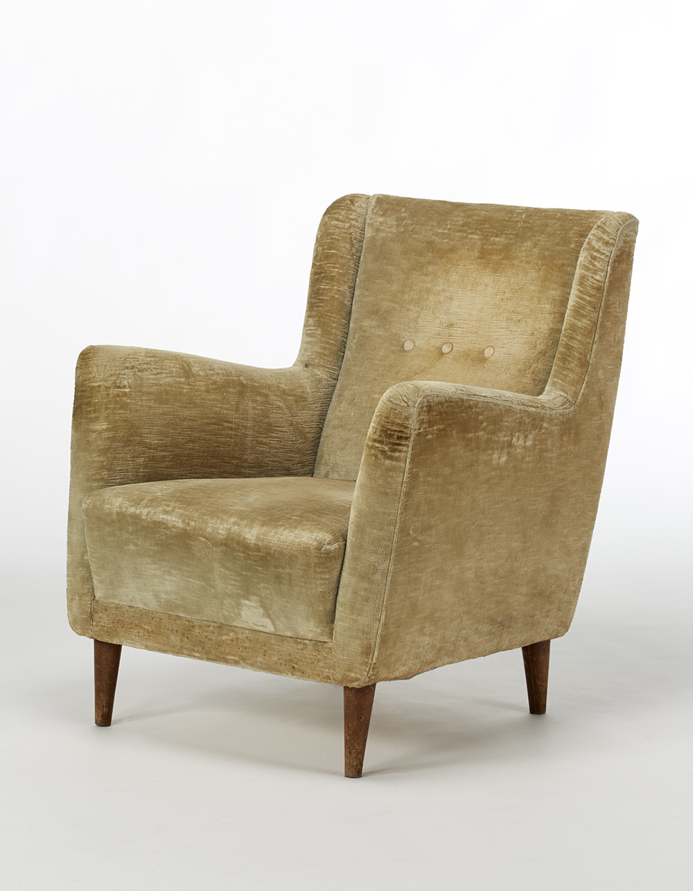 Poltrona imbottita per la motonave Conte Grande. Italia, anni '50. Struttura in legno di noce massello, rivestimento in velluto beige. (cm 72x82x70) (lievi difetti)