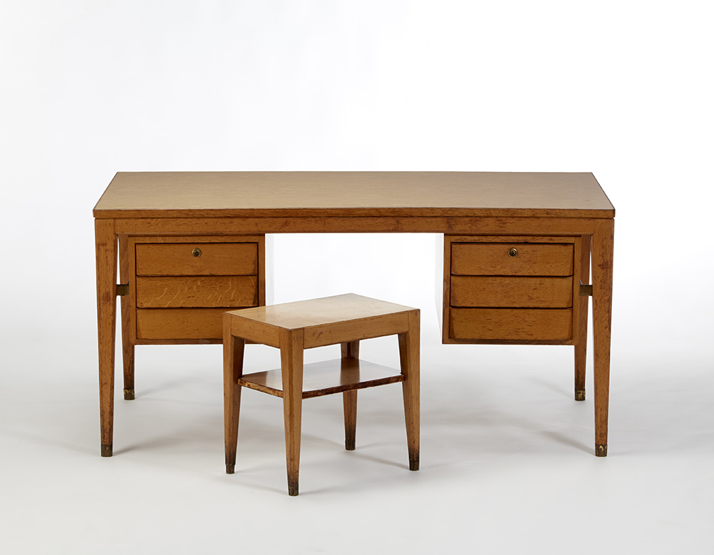 Scrivania da ufficio a sei cassetti per la BNL. Gambe rastremate a sezione ottagonale in legno massello di rovere, correnti laterali e puntali in ottone lucidato, piano rivestito in formica beige. Unita ad analogo sgabello. Italia, anni '50. (scrivania: cm 160x78x79; sgabello: cm 50x50x35) (lievi difetti e mancanze)