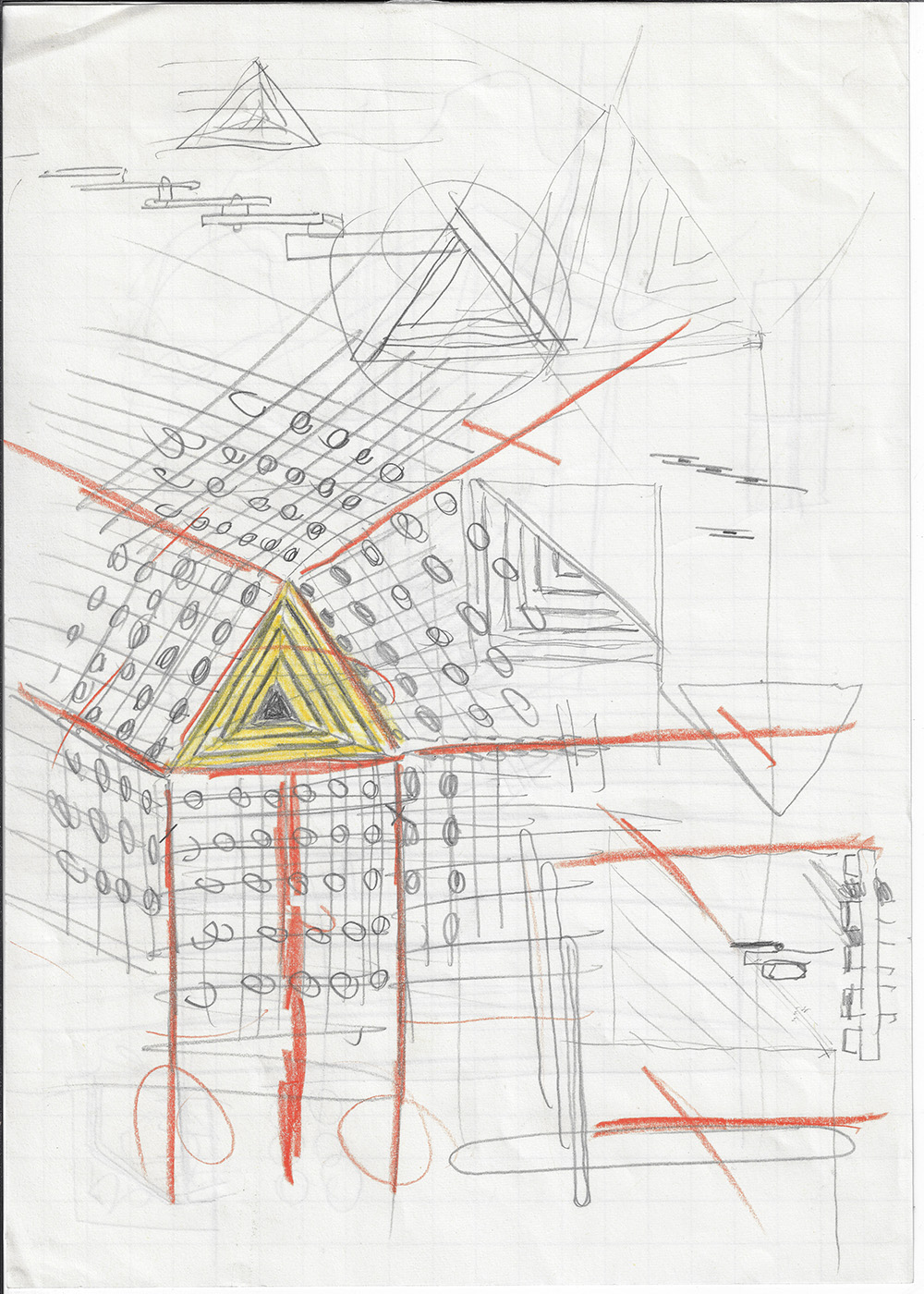 Progetto di restauro dell'ex convento di San Sebastiano a Venezia. Dettagli della boiserie dell'Aula "A" e studio dell'angolo. Venezia, 1975-1978. Grafite e pastelli colorati su carta a quadretti. (cm 29,7x21)