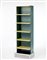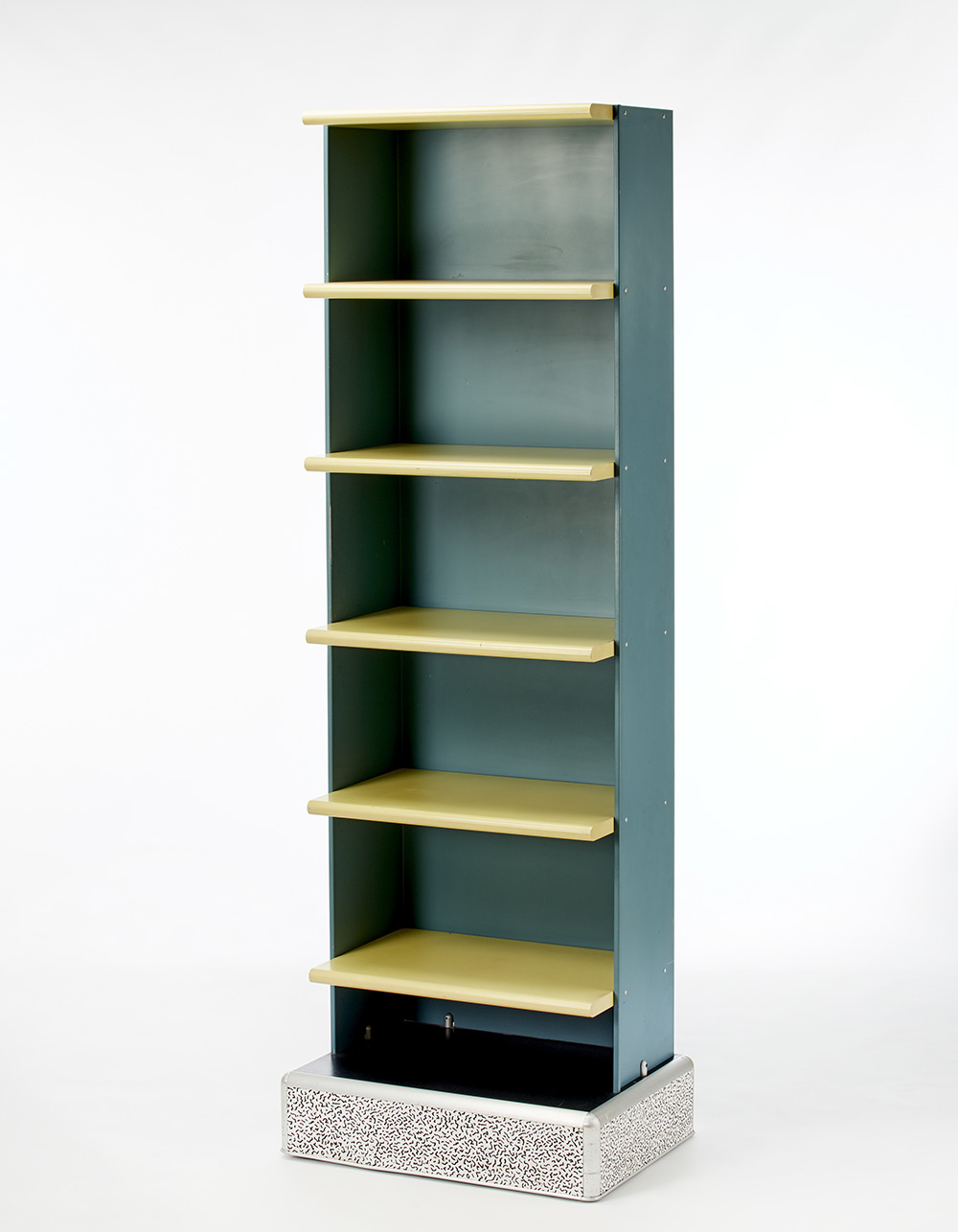 Mobile espositore a ripiani in metallo verniciato color carta da zucchero, base in alluminio e laminato bianco decorato a motivi neri. Ripiani in legno truciolare laccato color vaniglia. Realizzati su disegno per il negozio di vendita Fiorucci a Venezia. Milano, 1980. (cm 64,5x208,5x40,5) (lievi difetti)