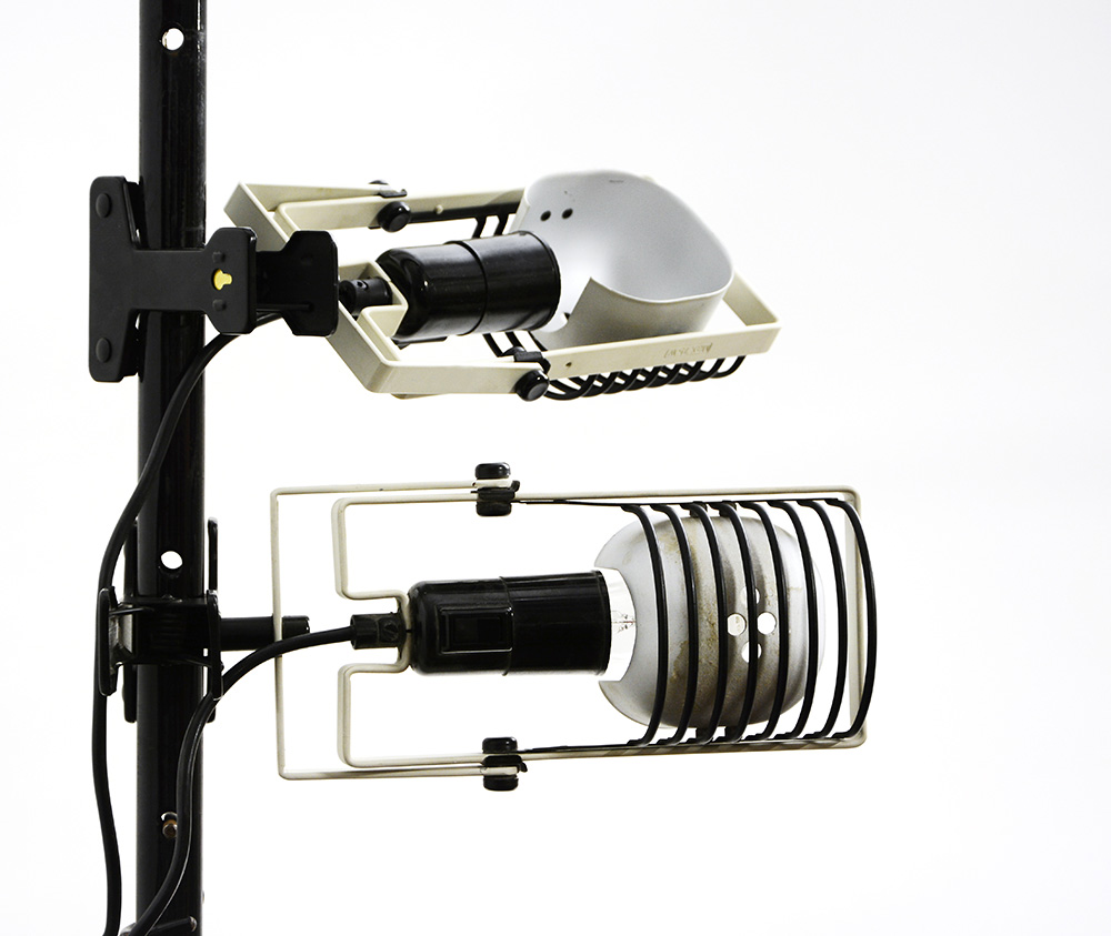 Coppia di lampade a pinza modello "Sinstesi". Produzione Artemide, Milano, 1976. Metallo laccato grigio chiaro e nero, plastica. Recante etichetta del produttore. (l braccio cm 20,5)