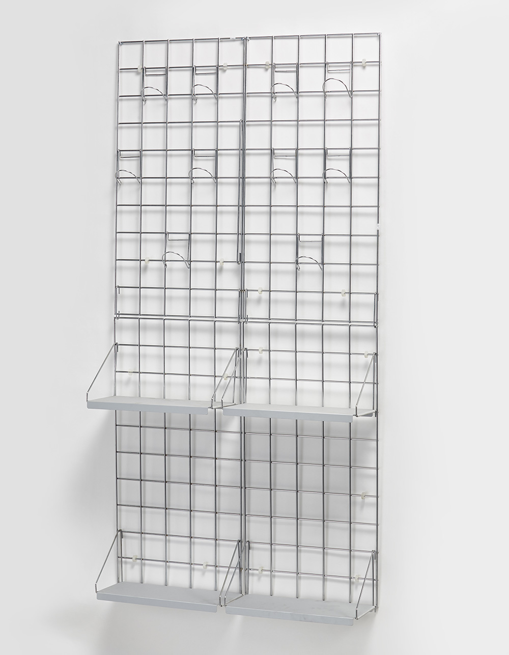 Portarobe costituito da quattro elementi con quattro mensole posizionabili a piacere. Produzione Robots, Milano, anni '70. Rete di acciaio e mensole in alluminio verniciato. (modulo: cm 40x80; mensole: cm 40x19,5)