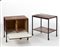 Due carrelli con struttura in profilato metallico laccato nero, ripiani e stipo contenitore impiallacciati in teak. Italia, anni '60. (cm 65x65x45) (lievi difetti)