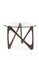 Tavolino con gambe in teak massello e ottone, con piano circolare in vetro. Italia, produzione recente. (h cm 51,5; d cm 70) (lievi difetti)