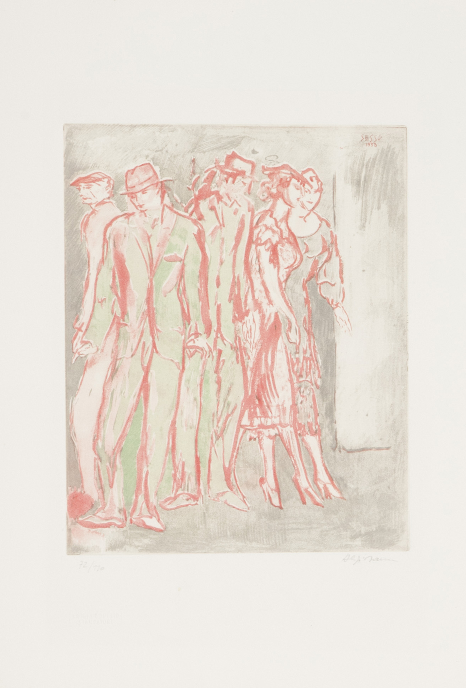 Aligi Sassu Figure Acquaforte di cm. 27,5x22, su carta di cm. 51,5x37,5, es. 72/110 Firma in basso a destra, tiratura e timbro a secco "Luigi De Tullio Stampatore", in basso a sinistra.