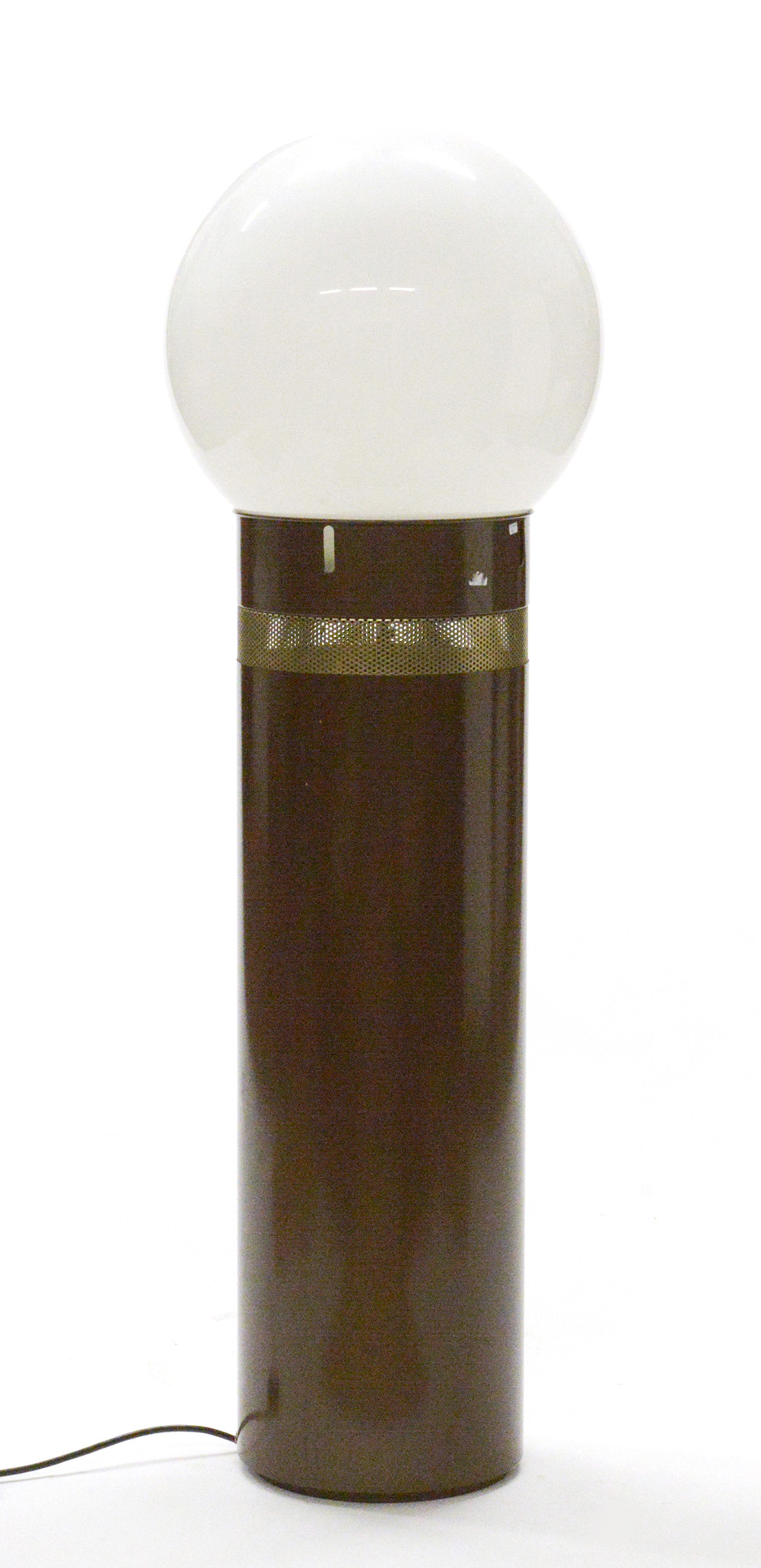 Lampada da terra modello "Oracolo". Produzione Artemide, Milano, 1969. Struttura tubolare in metallo verniciato e acciaio forato, grande paralume a globo in vetro incamiciato lattimo. (h cm 140; d cm 40) (lievi difetti)