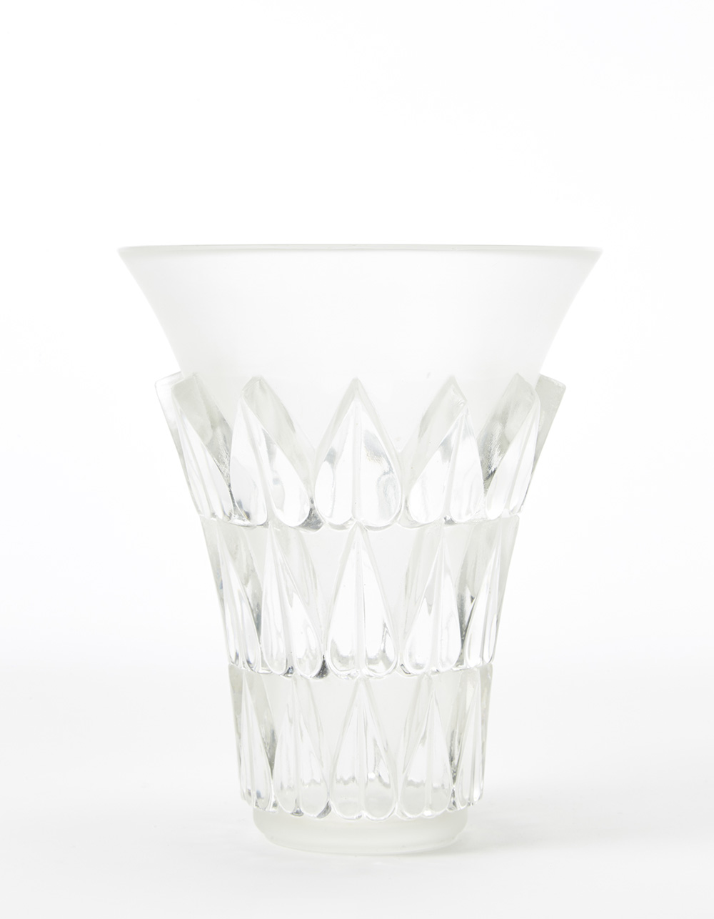 Vaso modello "Feuilles". Esecuzione Lalique, Francia, Disegno del 1934. Vetro incolore soffiato in stampo e parzialmente acidato sulla superficie esterna. Firmato "R LALIQUE FRANCIA". (h cm 18,5; d cm 15,5) (lievi difetti)