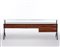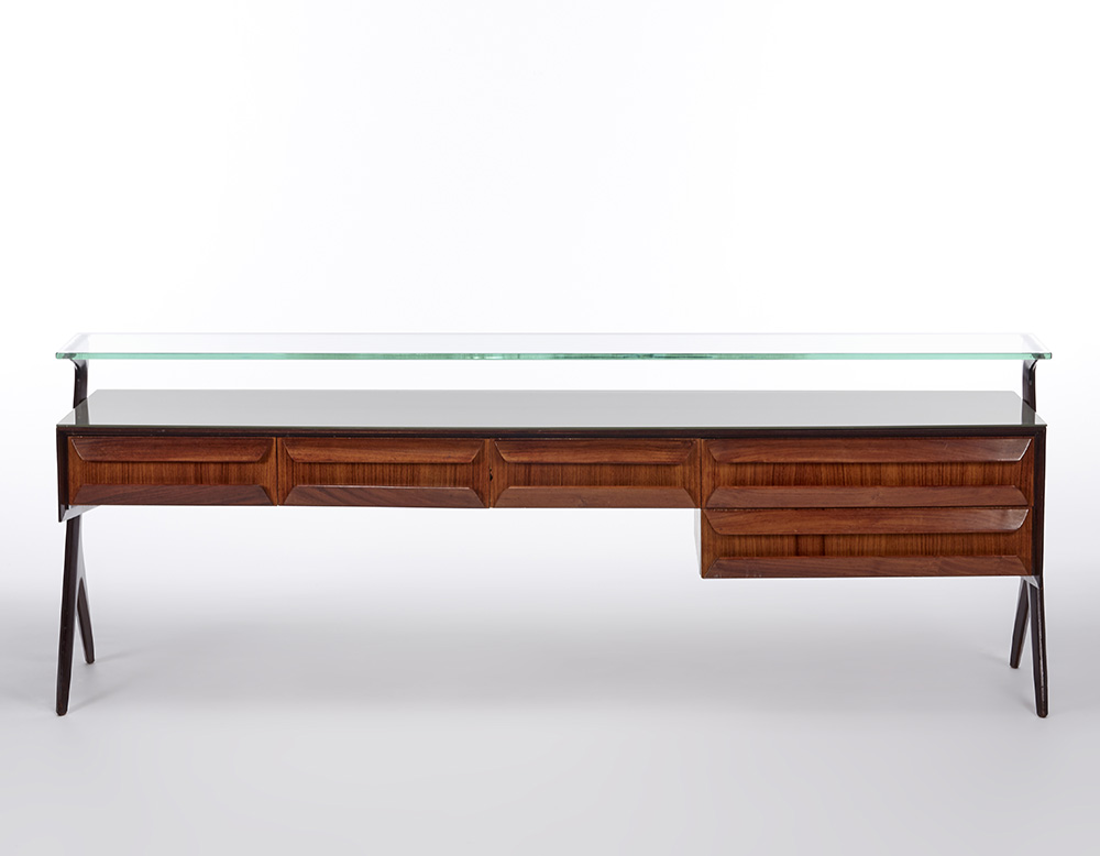 Cassettiera in legno impiallacciato e bordato in palissandro indiano con piano in vetro retroverniciato argento e alzata in cristallo molato. Italia, anni '60. (cm 203x72,5x51) (difetti)