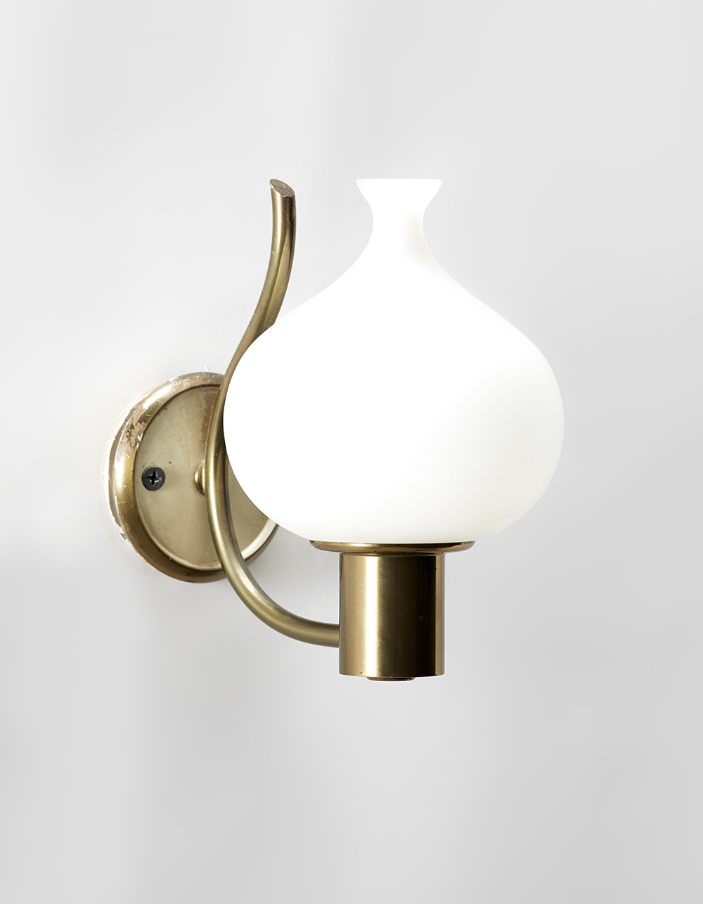 Applique modello "12650". Produzione Arredoluce, Monza, 1957ca. Struttura in ottone lucido e vetro lattimo. (h cm 17) (lievi difetti)