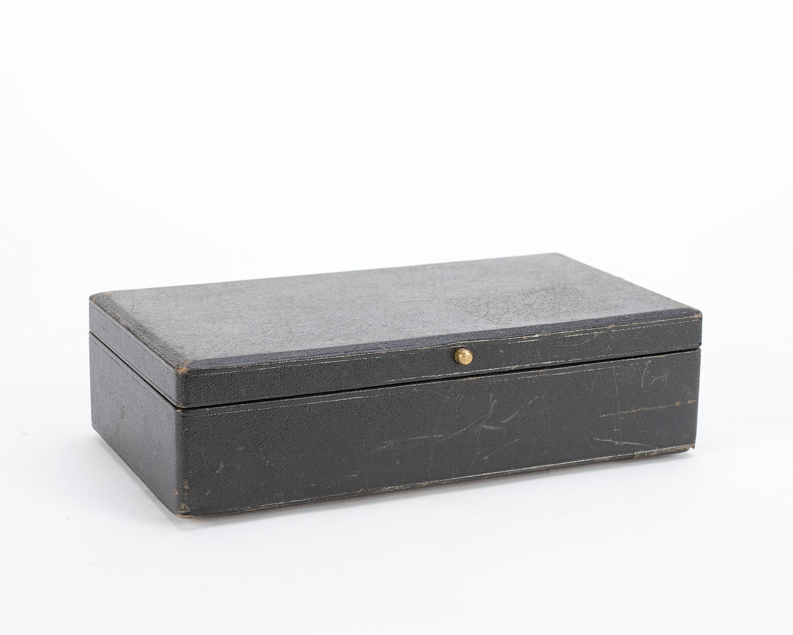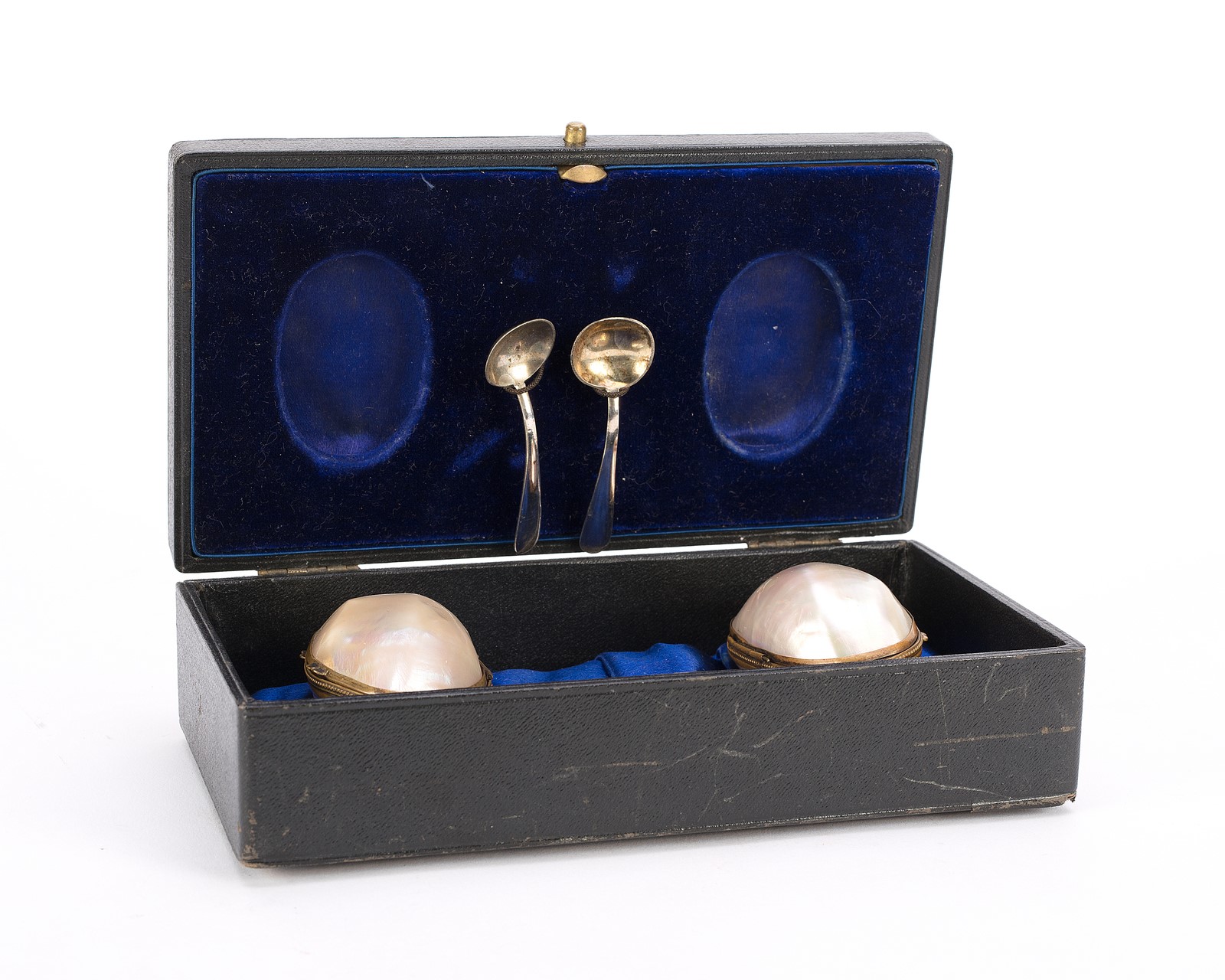MANIFATTURA DEL XIX SECOLO Coppia di contenitori in madreperla . . Cm 19,00 x 5,50 x 10,50. probabilmente da caviale con cucchiaini in argento, in scatola coeva.