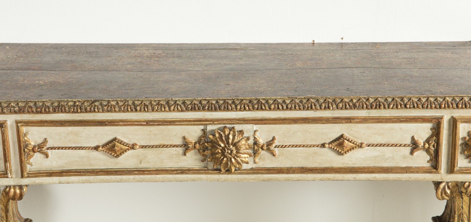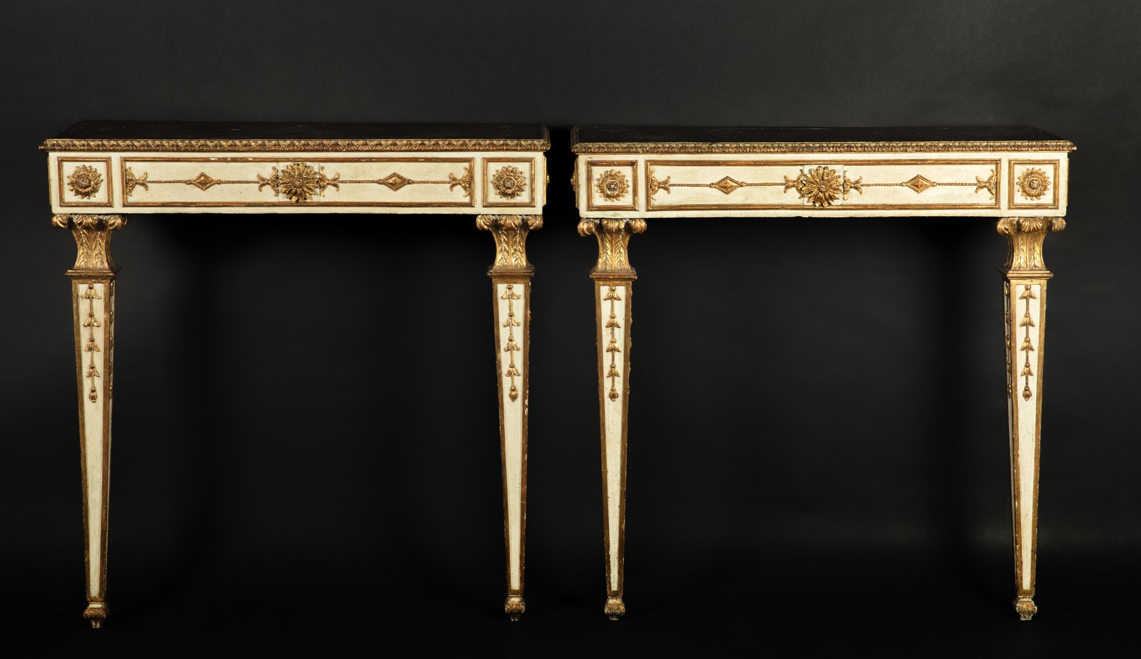 EARLY 19th CENTURY MANUFACTURE Pair of lacquered wooden consoles, inverted pyramid-shaped legs, band decorated with gilded wooden friezes. . Cm 100,00 x 97,00 x 35,00. Defects.