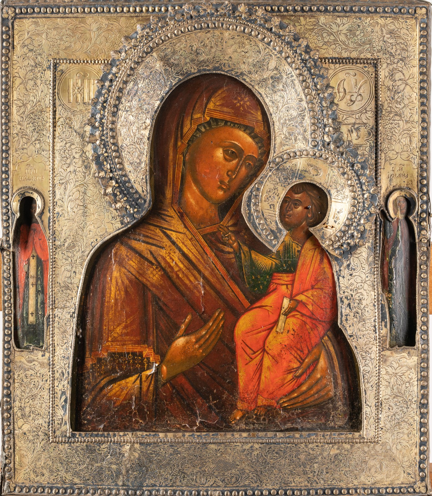 ICONA RUSSA DEL XVIII SECOLO La Vergine di Tichvin in riza in argento dorato. Tempera su tavola. Cm 27,00 x 32,00. Presenti punzoni.