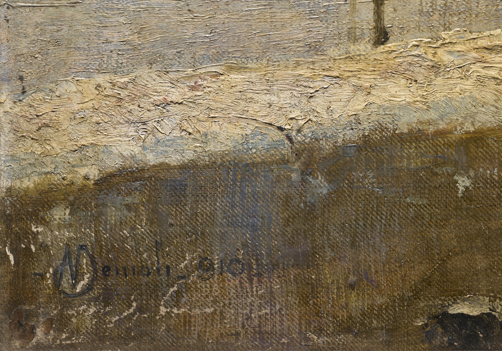 ARTISTA DEL XIX SECOLO Inverno. 1910. Olio su tela . Cm 90,00 x 100,00. Firmato Memoli in basso a destra e datato 910. Cornice presente