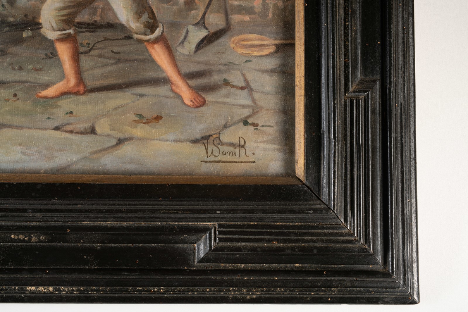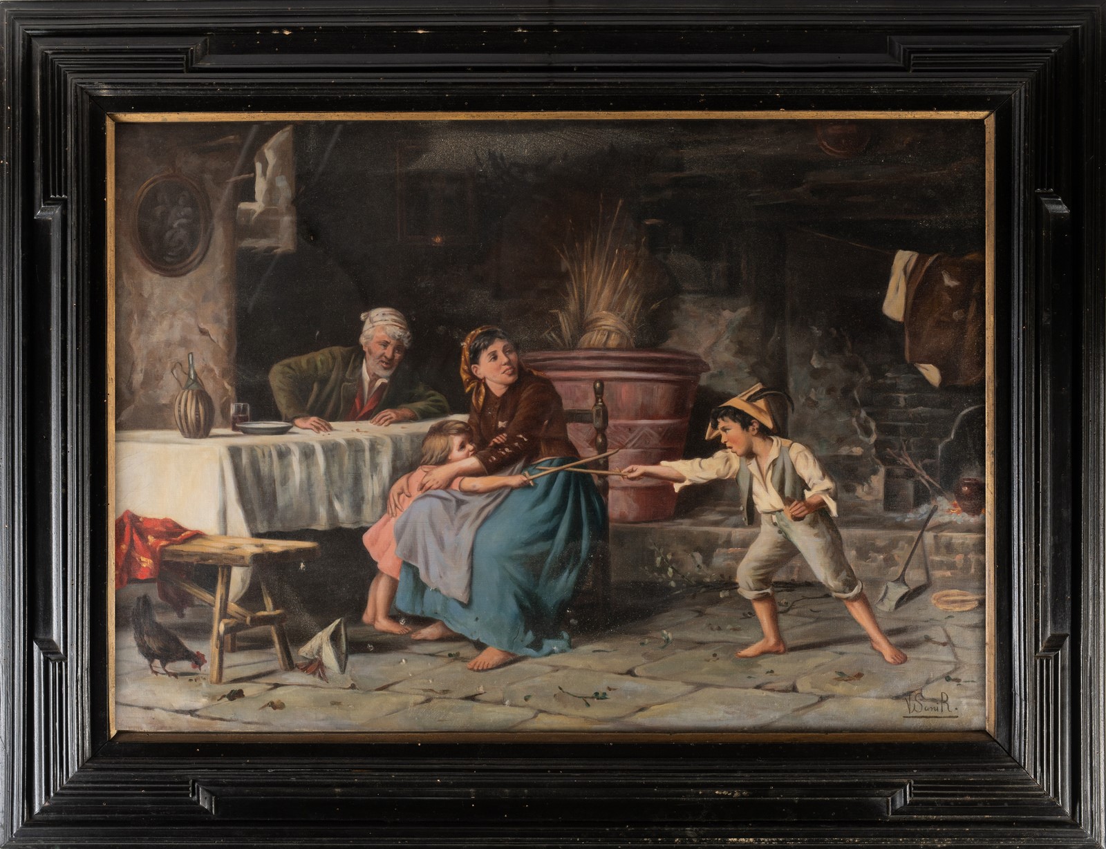 ARTISTA DEL XIX SECOLO Scena d'interno contadino. . Olio su tela . Cm 104,00 x 74,00. Firmato in basso a destra Sani R. In cornice in ebanizzata del XIX secolo.