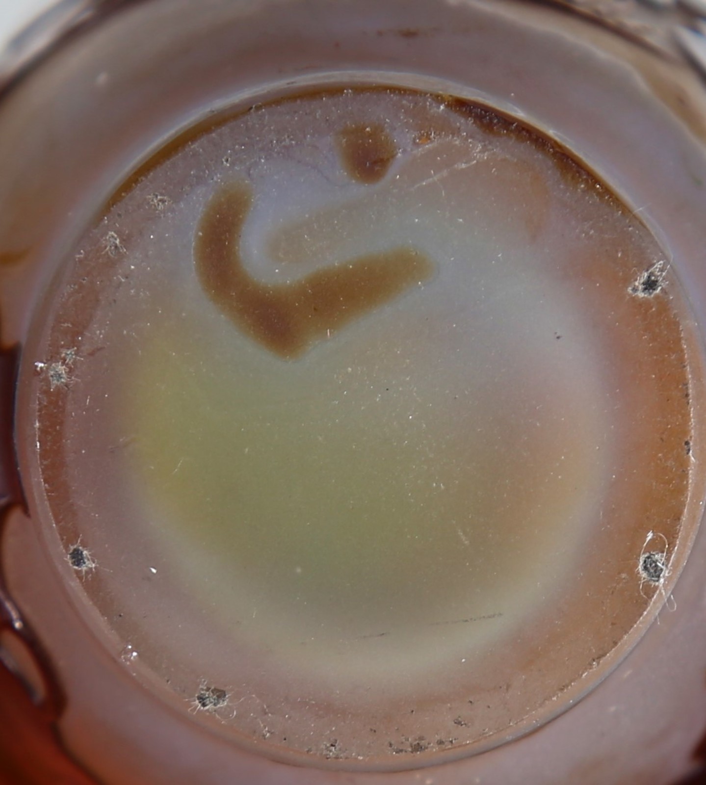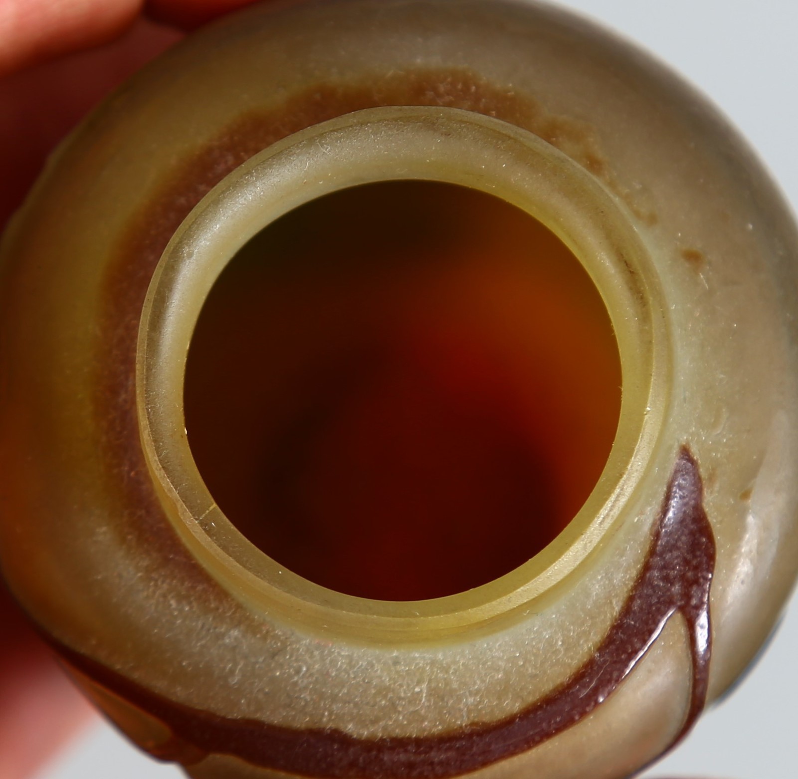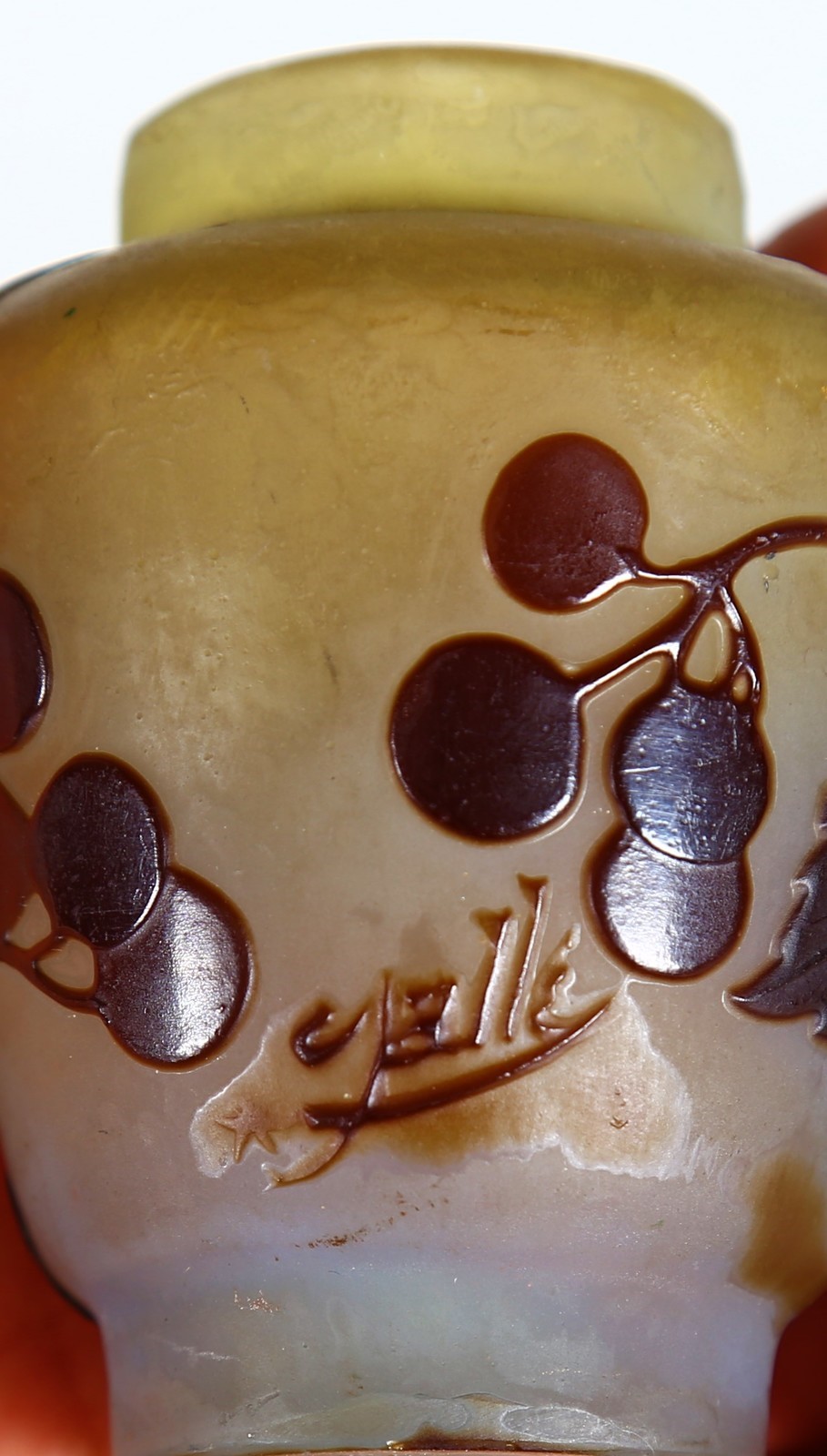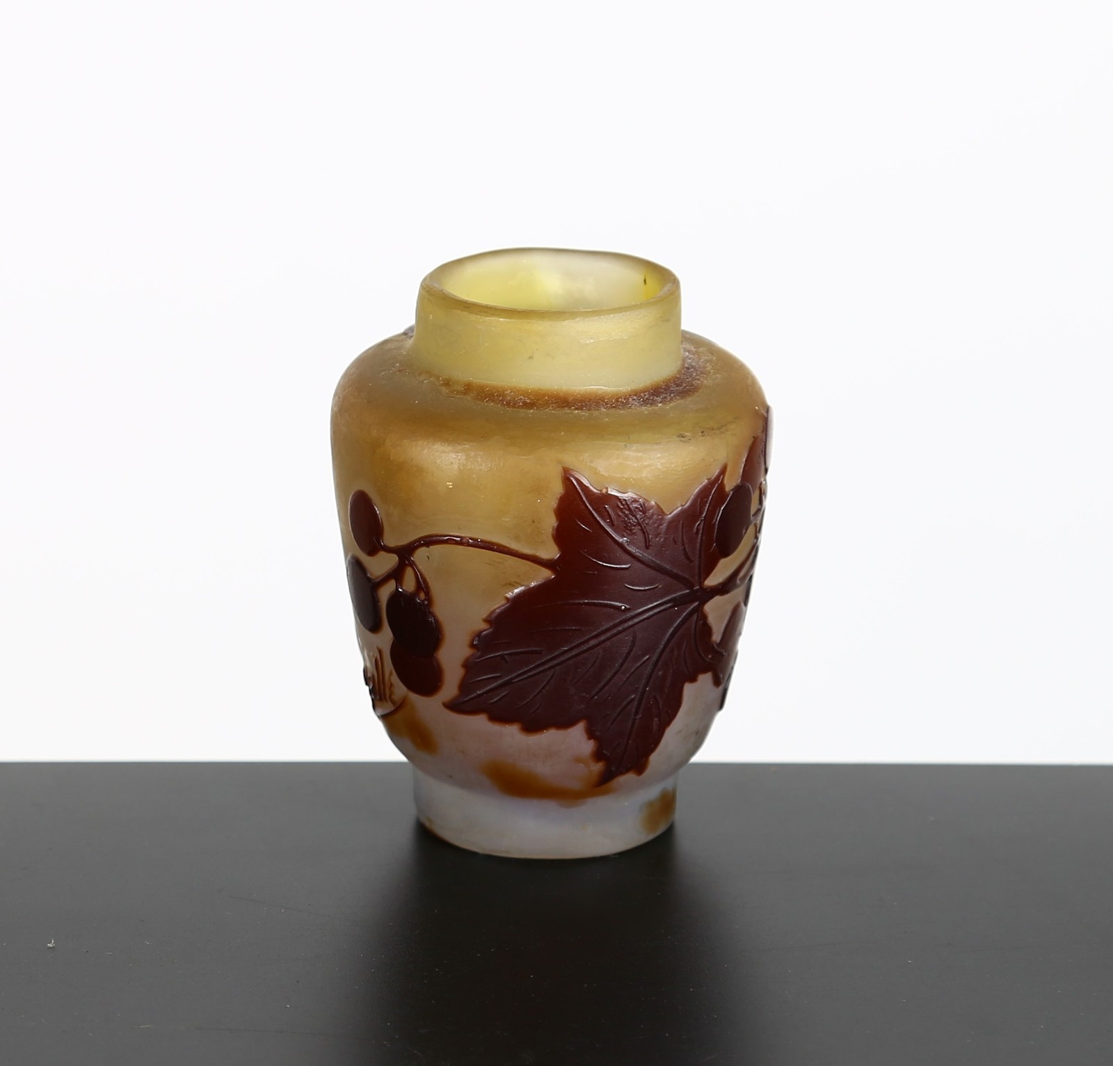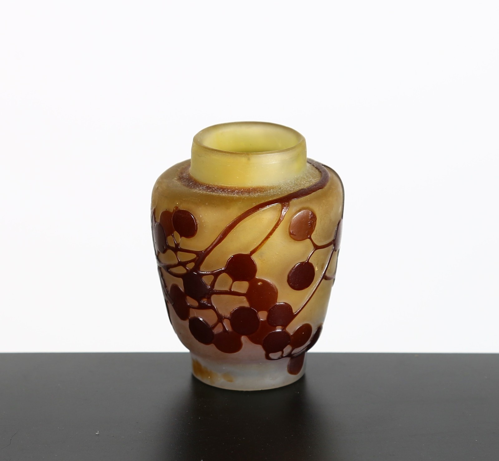 GALLE' Vasetto ovoidale in vetro doppio decoro di Grataeghus e foglie nei toni del marrone finemente inciso ad acido su fondo grigio sfumato verdino. . . Cm 6,00. Firma in rilievo a cammeo "Gallè", epoca 1905 con la stella. Parere verbale di Borga Franco.