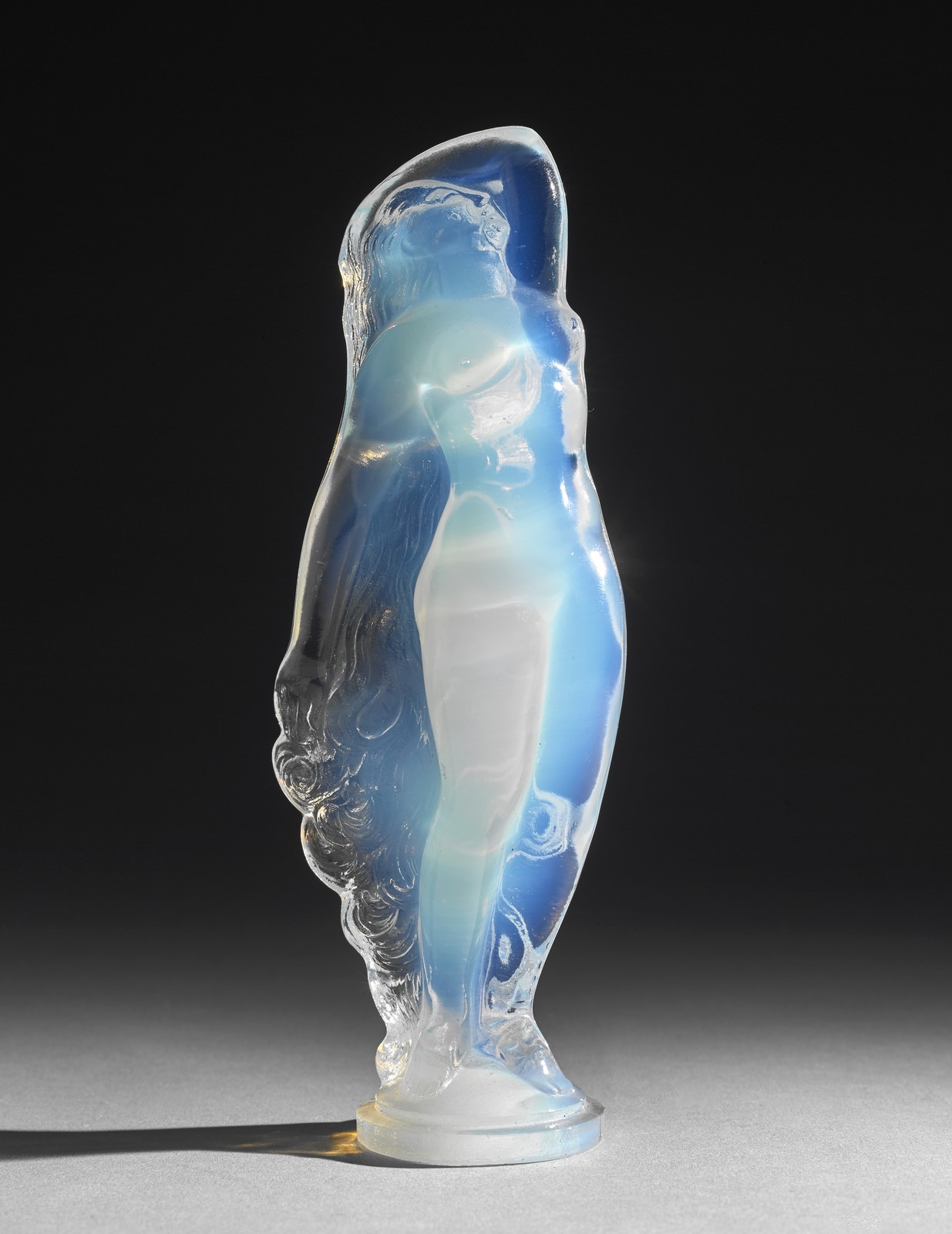SABINO Figura le Reveil, modello n. 8549; statuina in cristallo opalescente dalla lunga capigliatura riposante su base circolare. . . Cm 17,00. Firma impressa a rilievo "Sabino Paris", epoca 1935. Autentica su fotografia a cura di Borga Franco. Pubblicazione: Victor Arwas, The art of glass, art nouveau to art decò, Sunderland Museum and Art Gallery, Ed. Andreas Papadakis, 1996.