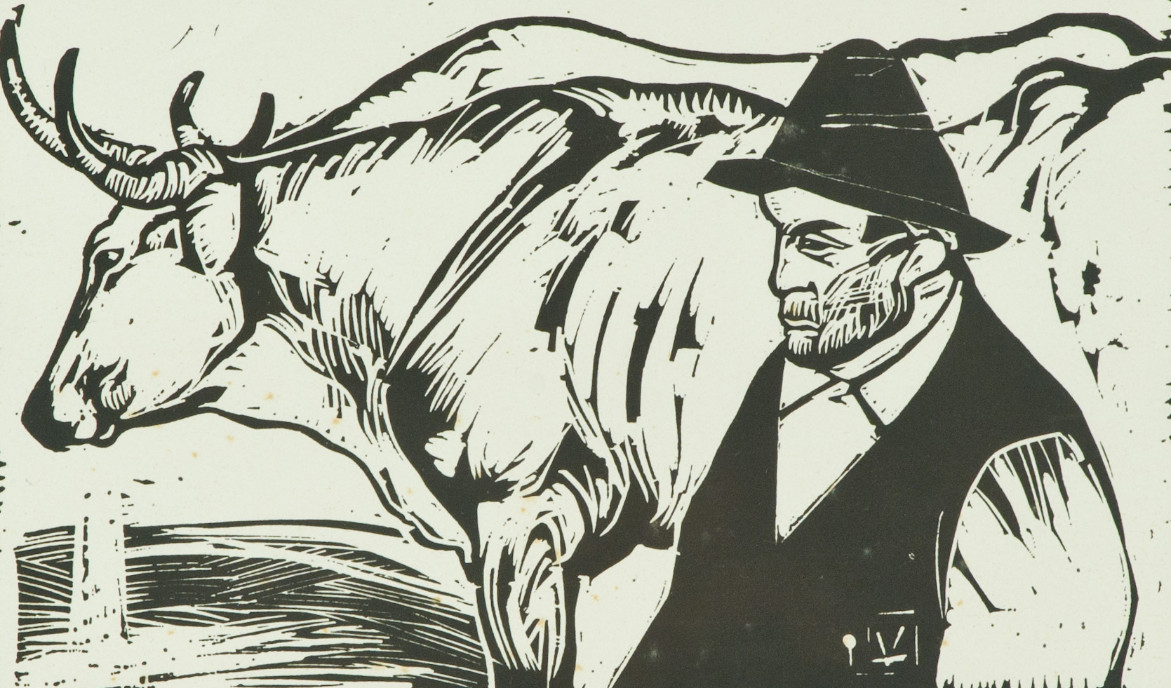 Lorenzo Viani Contadino e buoi Xilografia di cm. 18,5x30, su carta di cm. 35x50 La carta presenta fioriture. Siglato sulla lastra in basso a destra.