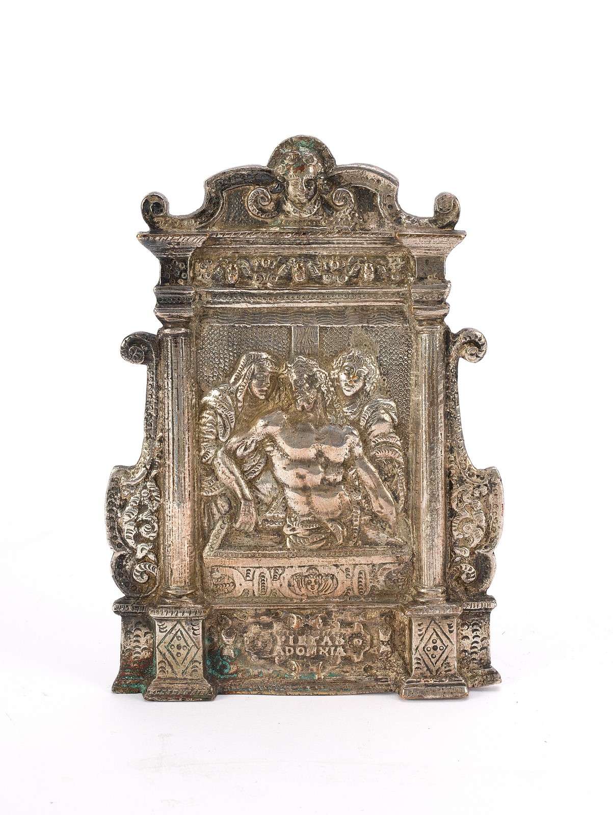 MANIFATTURA VENETA DEL XVII SECOLO Pace in bronzo argentato. . Cm 12,00 x 16,00. Cornice architettonica sormontata da cherubino fra volute, raffigurante Cristo deposto dalla croce tra la Madonna e San Giovanni ed iscritta sul basamento "Pietas ad omnia":