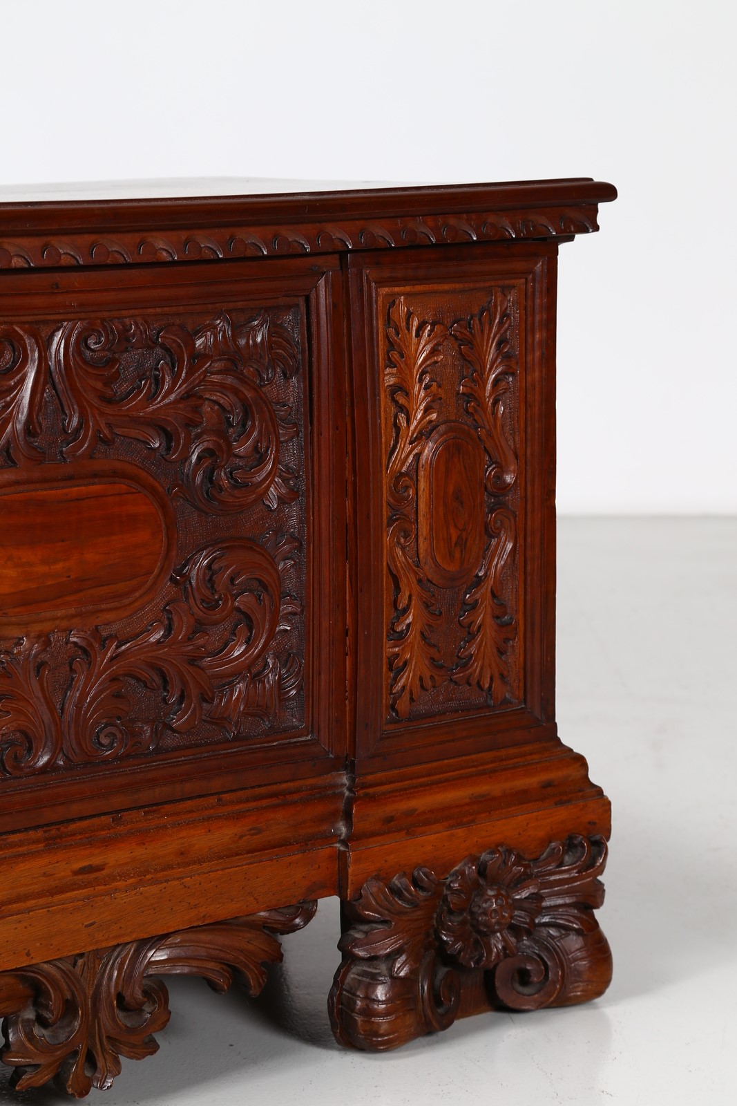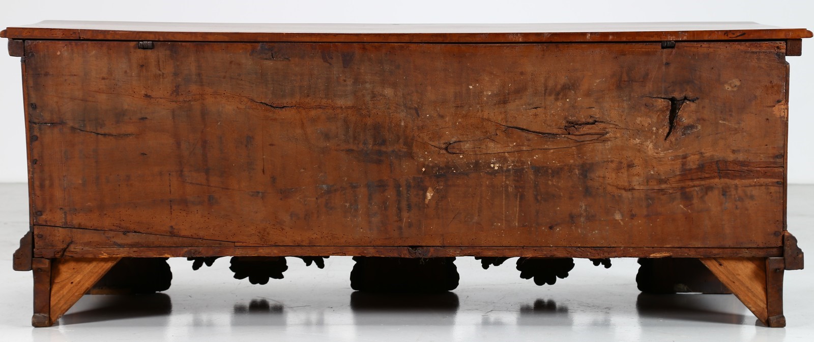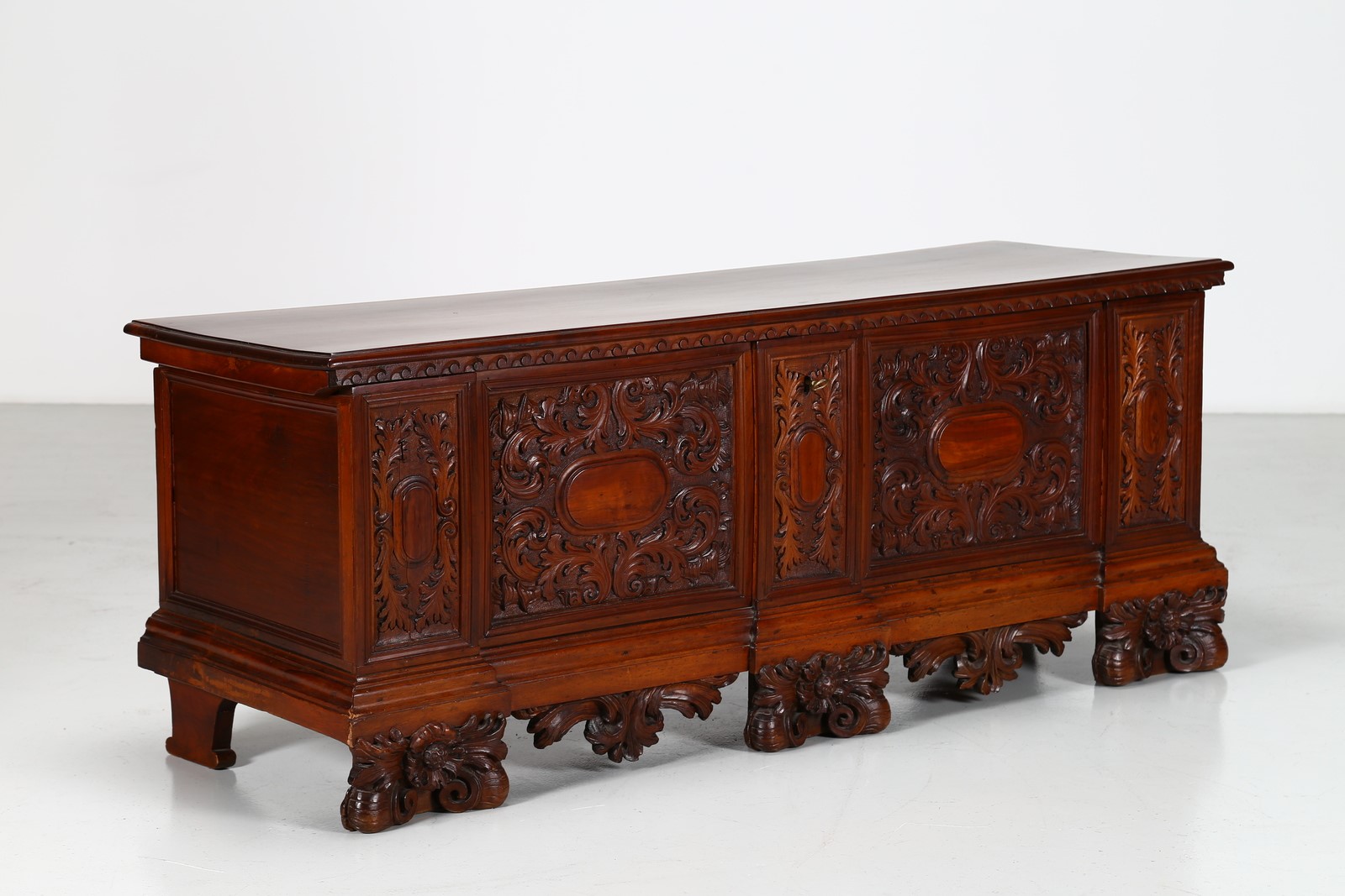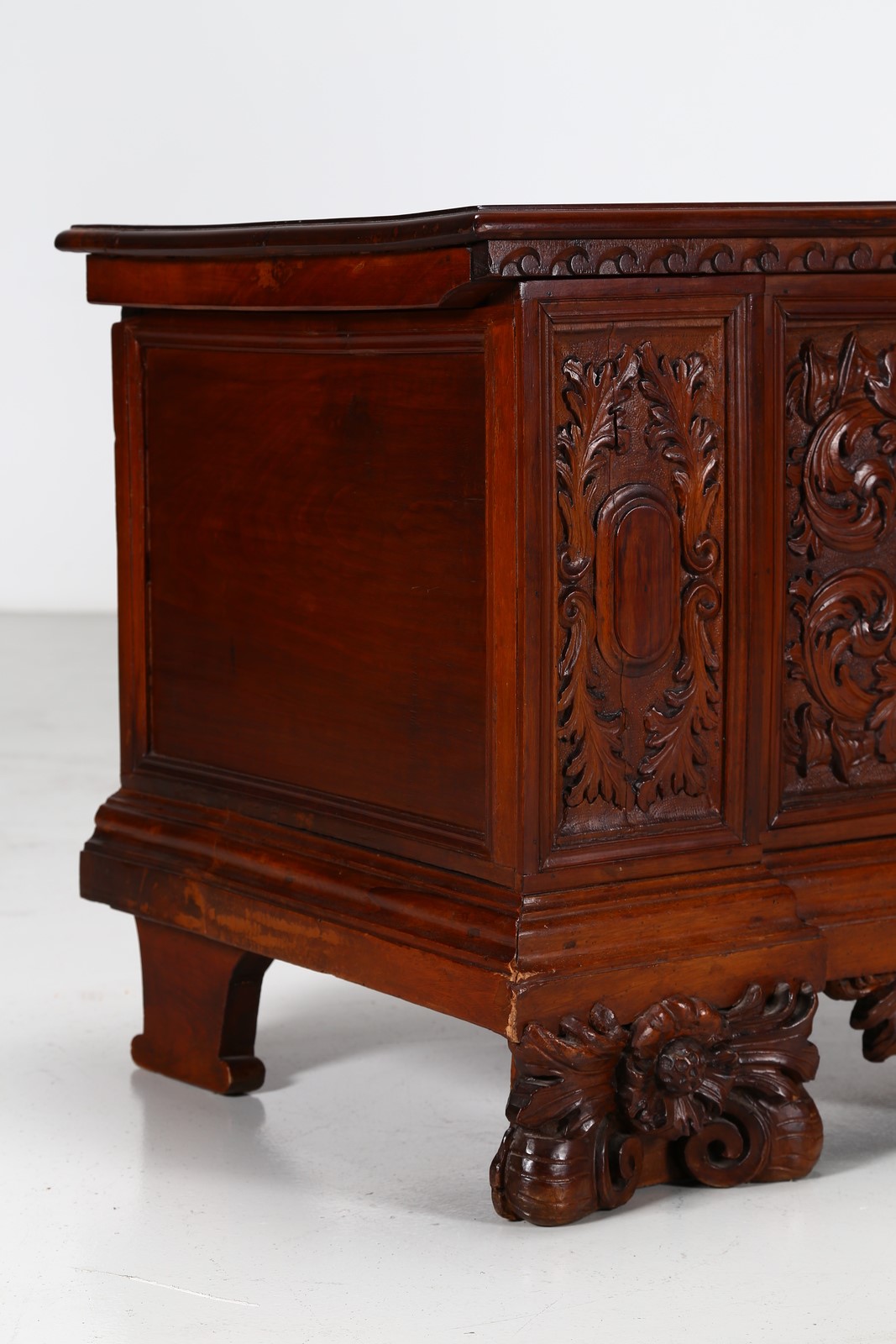 MANIFATTURA VENETA DEL XVII SECOLO Cassapanca in legno di noce finemente...