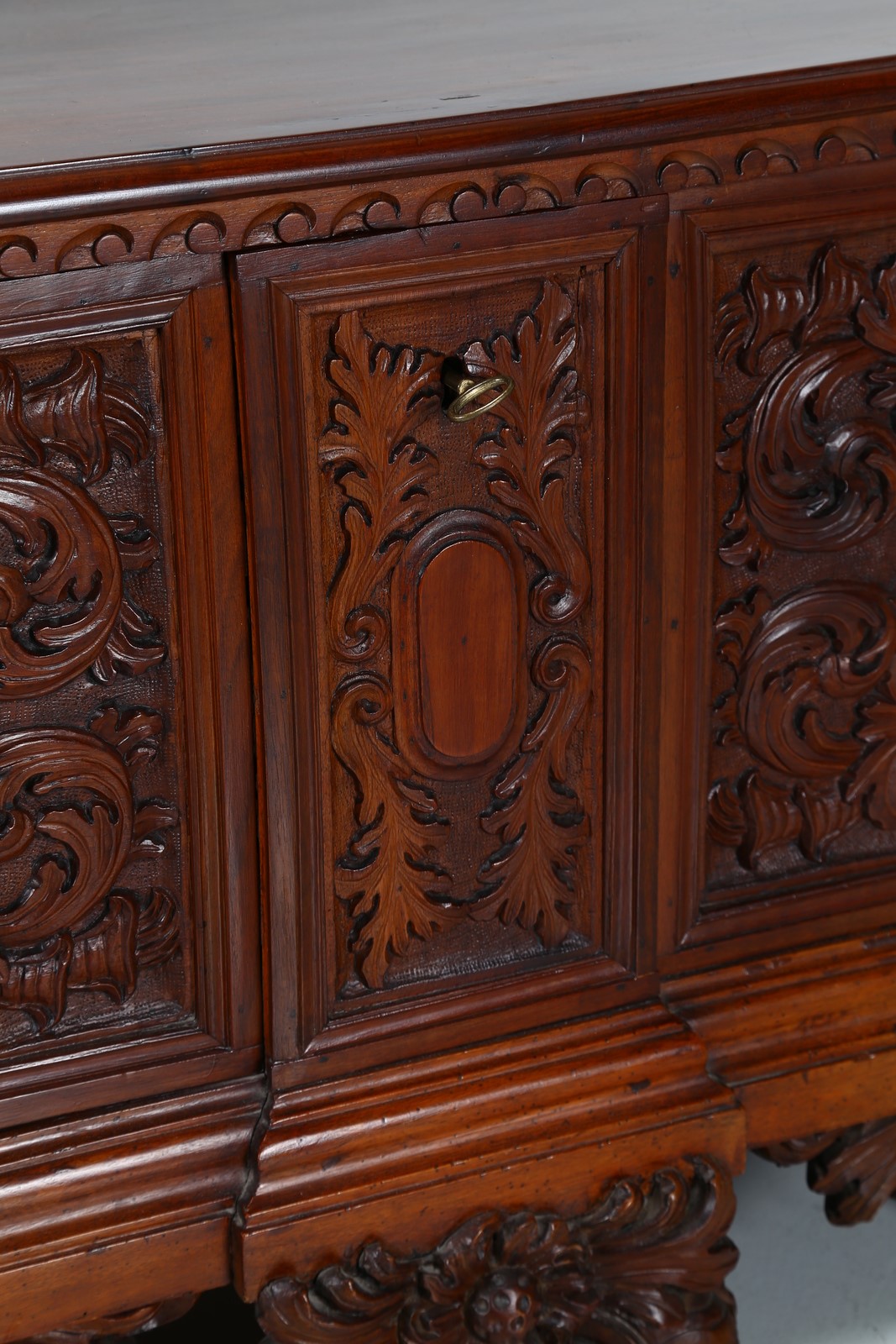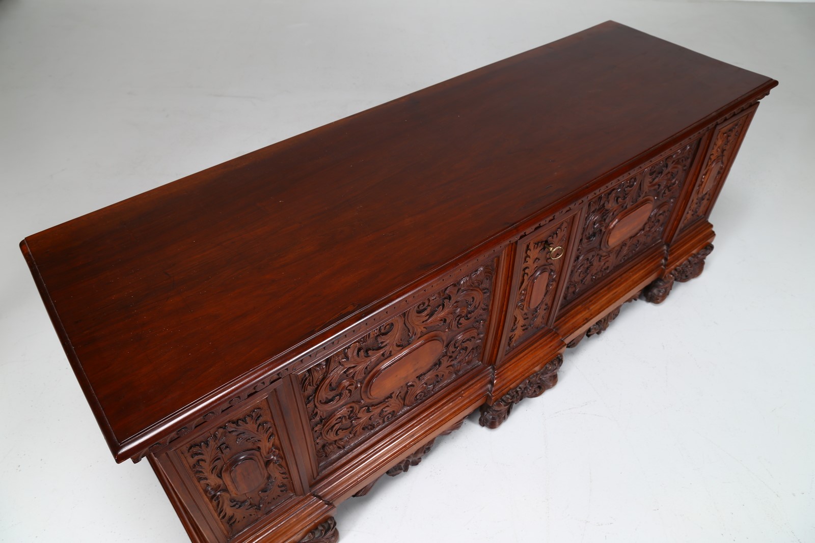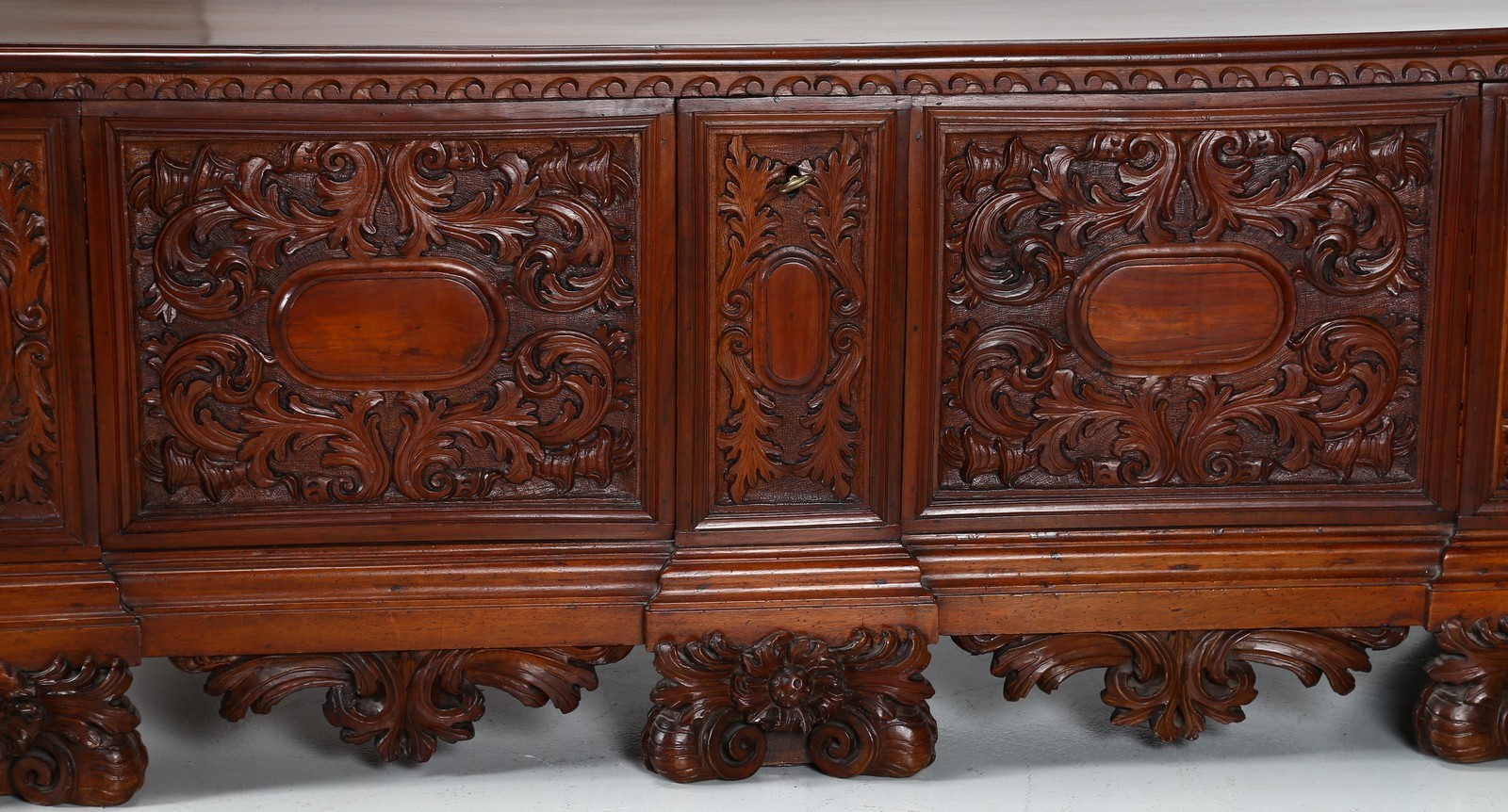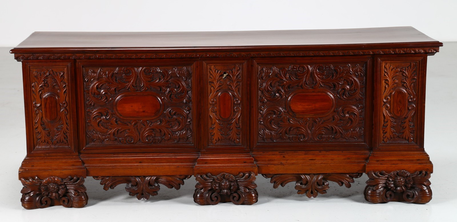 MANIFATTURA VENETA DEL XVII SECOLO Cassapanca in legno di noce finemente intagliata a motivi fogliacei centrati da formelle. . Cm 174,50 x 67,50 x 59,00.