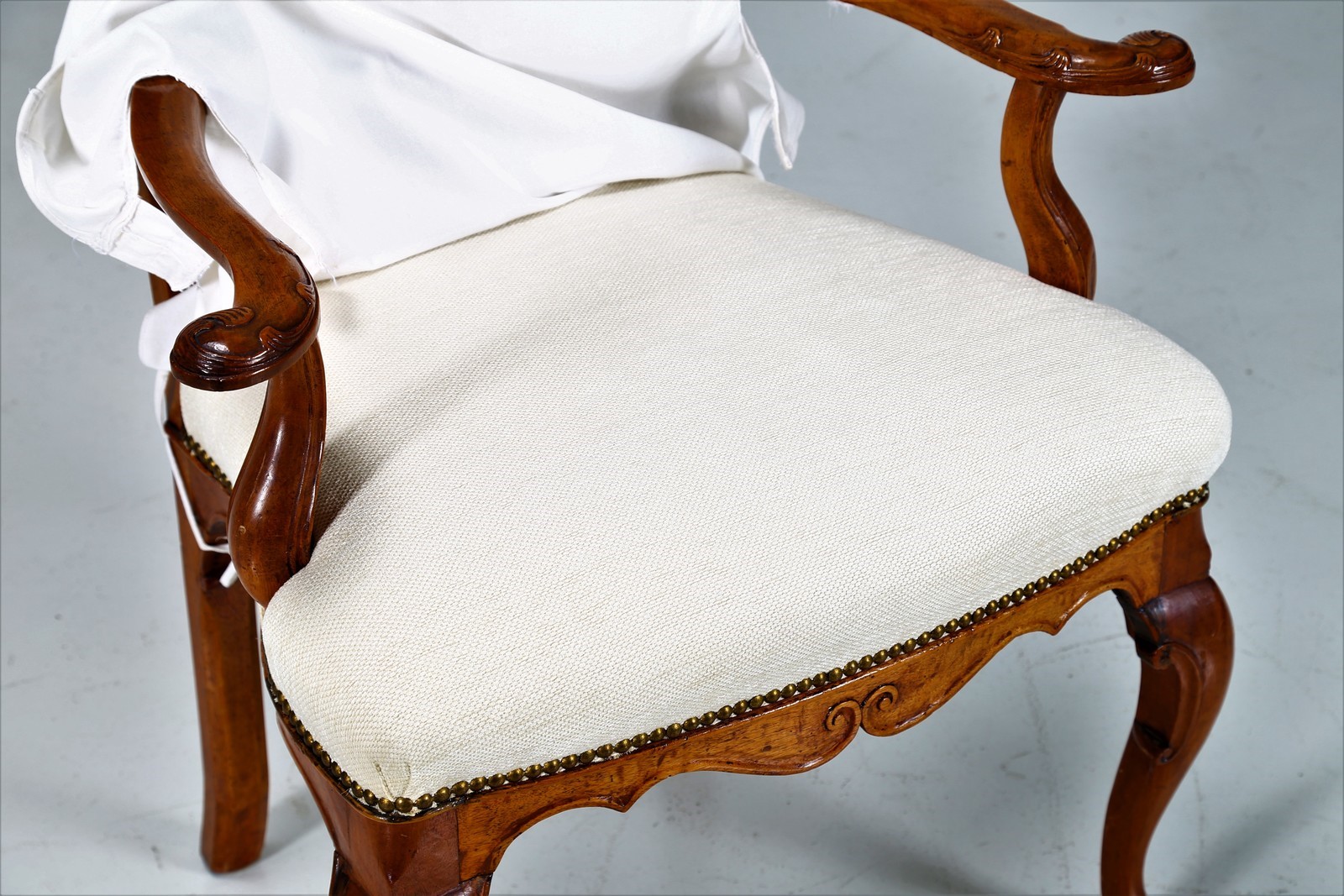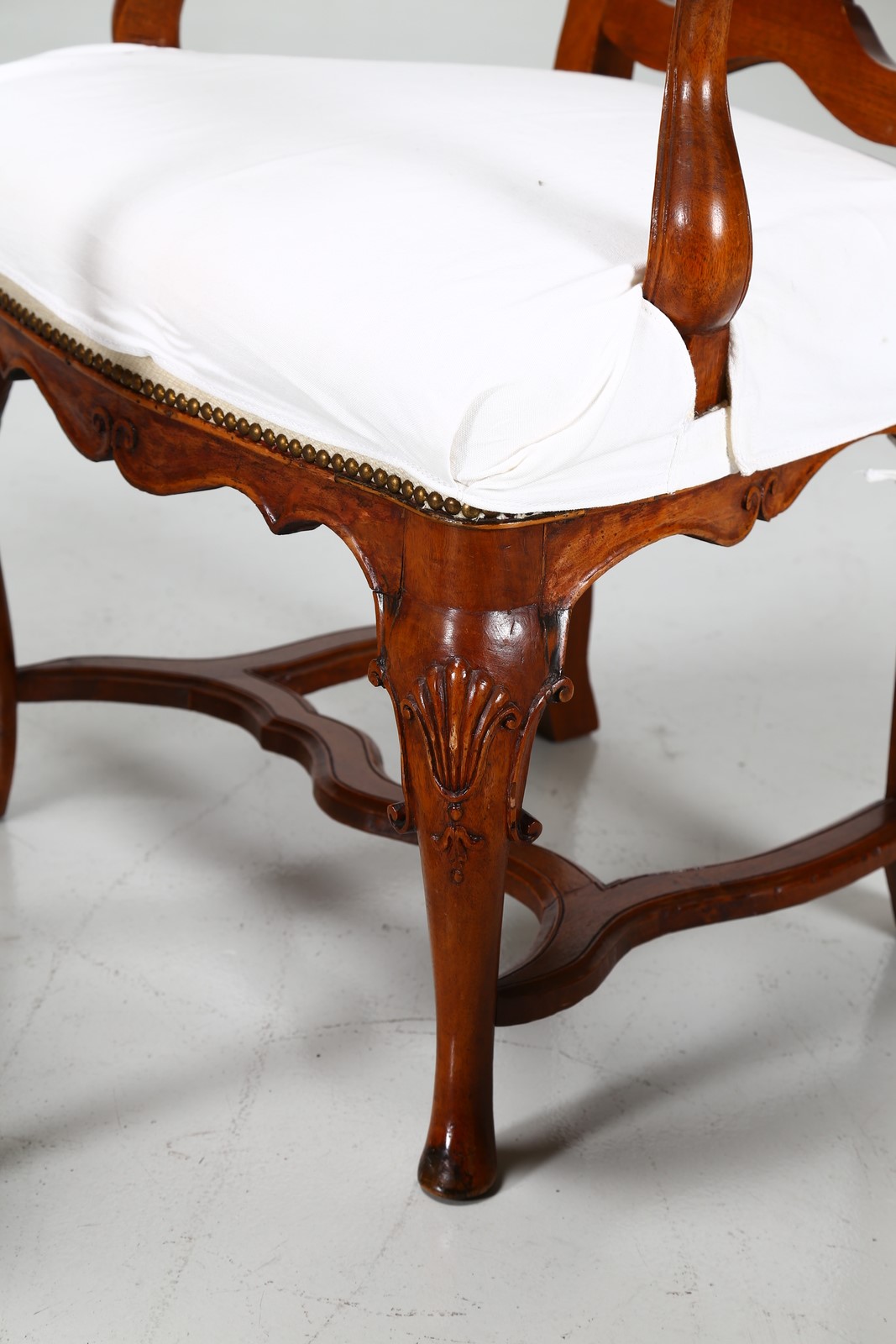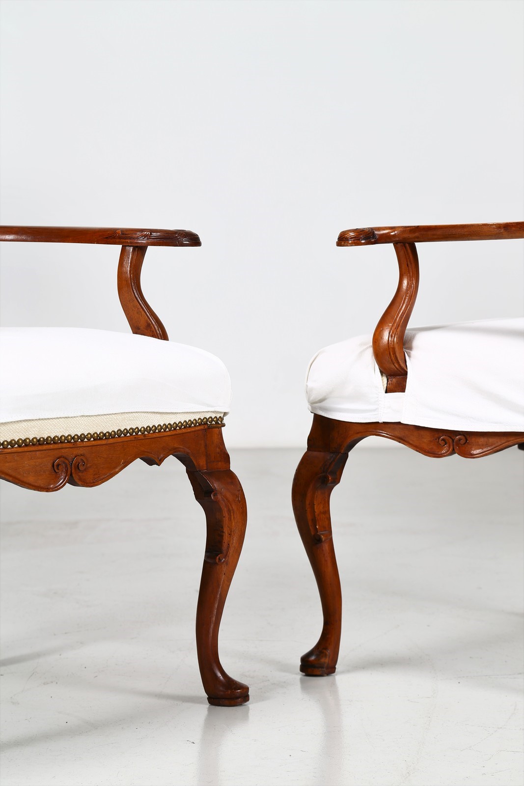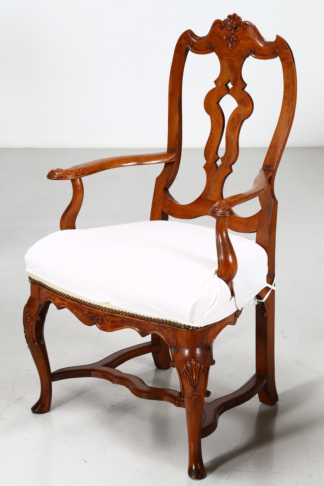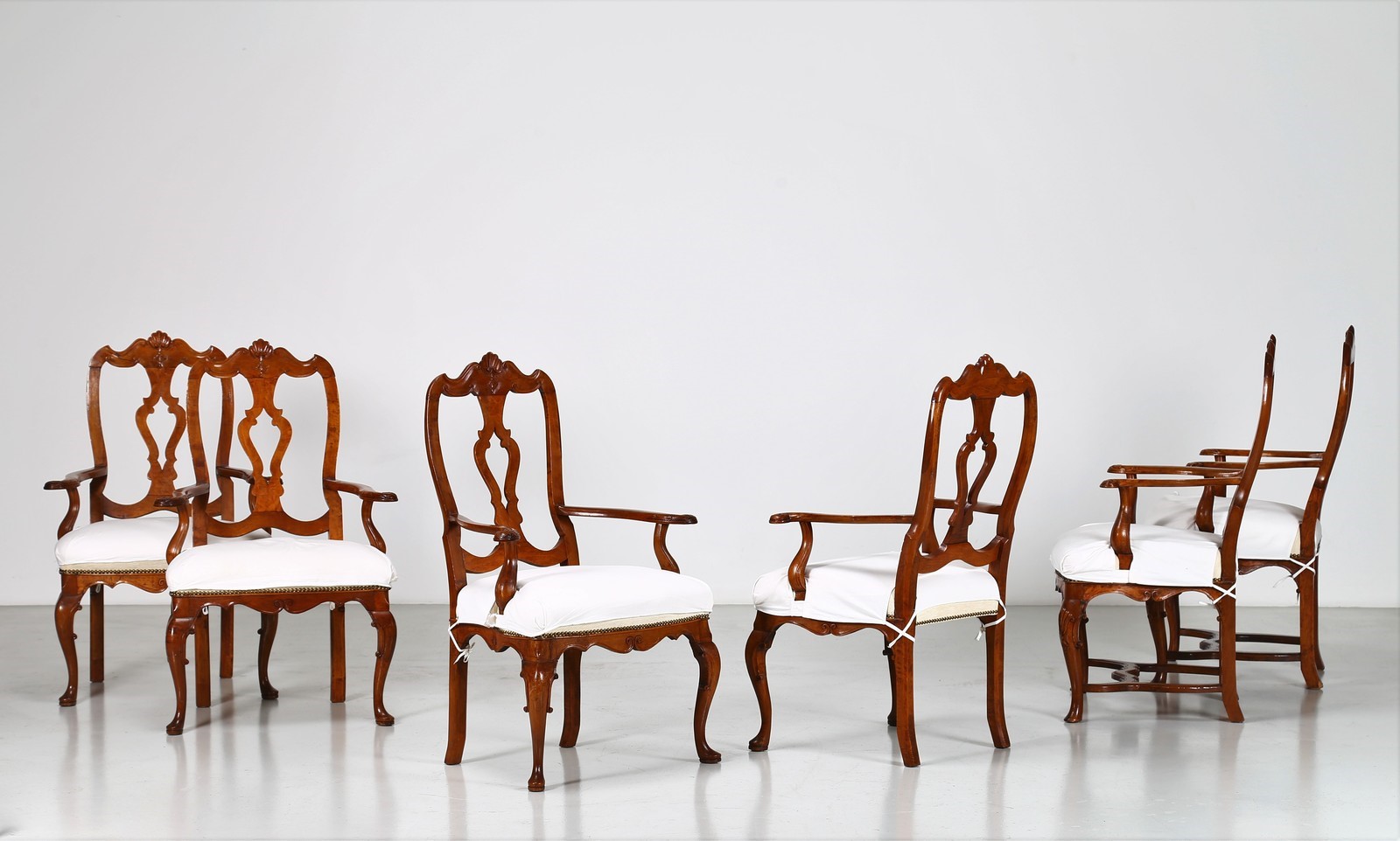 MANIFATTURA VENETA DEL XVIII SECOLO Gruppo di sei poltrone Luigi XV. . Cm 67,00 x 106,00 x 58,00. In legno di noce intagliato, gambe arcuate, schienale a giorno. Ottimo stato conservazione, minimi difetti.
