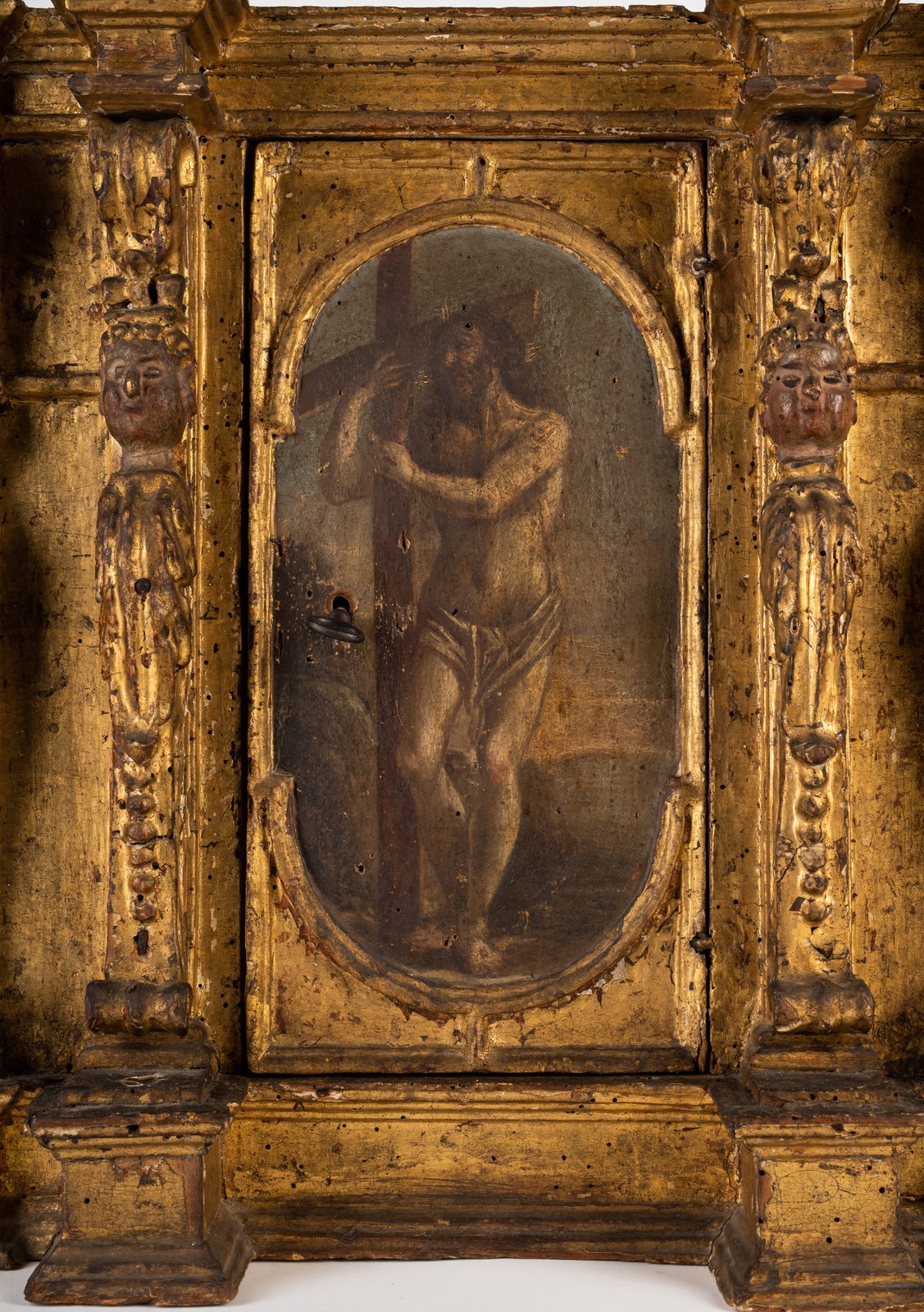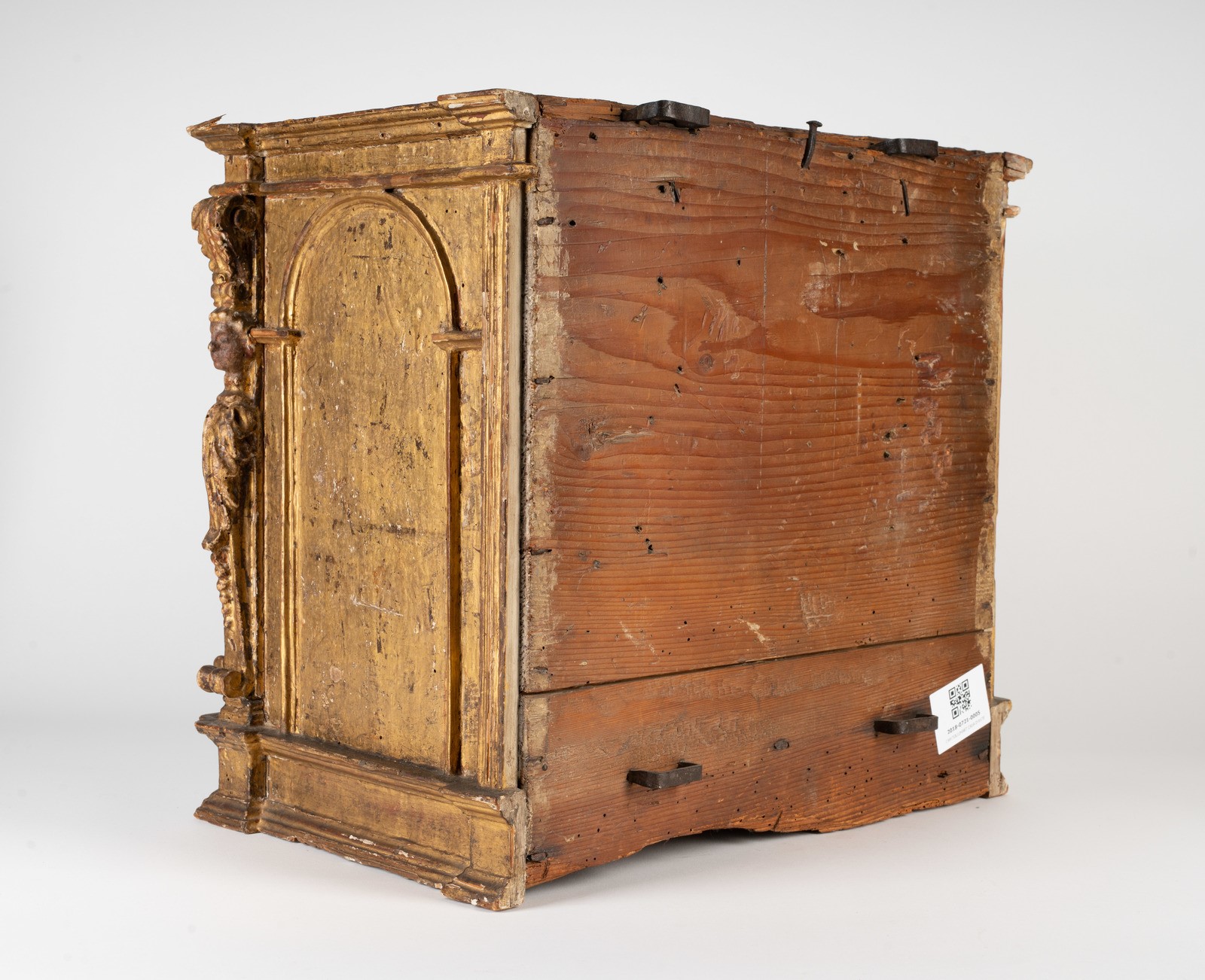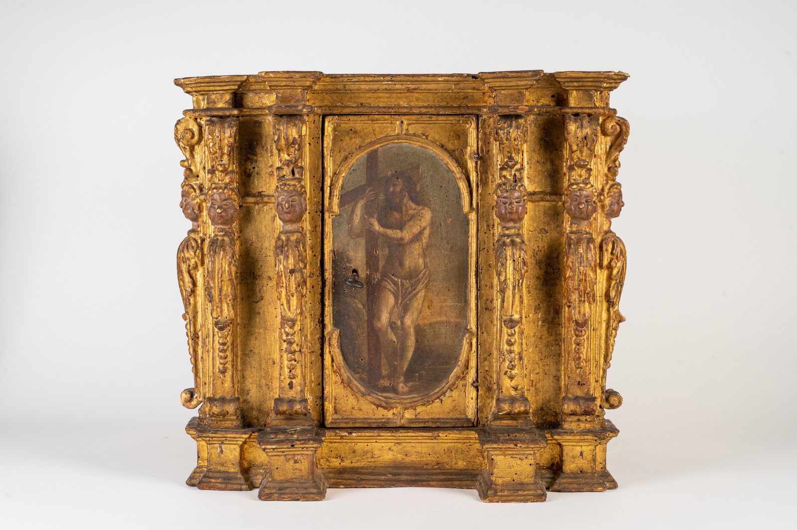 MANIFATTURA ITALIANA DEL XVII SECOLO Tabernacolo in legno intagliato e dorato. . Cm 43,00 x 40,00 x 30,00. Sportellino dipinto a raffigurare San Giovanni Battista. Fronte e fianchi ritmati da cariatidi scolpite e dorate.