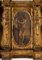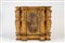 MANIFATTURA ITALIANA DEL XVII SECOLO Tabernacolo in legno intagliato e dorato. . Cm 43,00 x 40,00 x 30,00. Sportellino dipinto a raffigurare San Giovanni Battista. Fronte e fianchi ritmati da cariatidi scolpite e dorate.