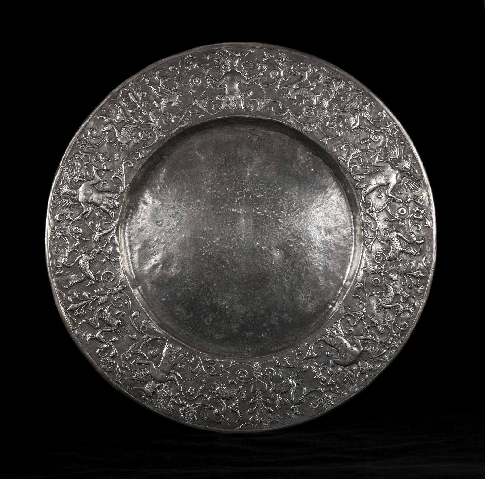 ARGENTIERE DELL'ITALIA CENTRALE XVII SECOLO Grande piatto in argento cesellato e sbalzato a grottesche, satiri e animali fantastici. . Cm 38,00. Punzoni alla base, BPF. Peso gr 580.