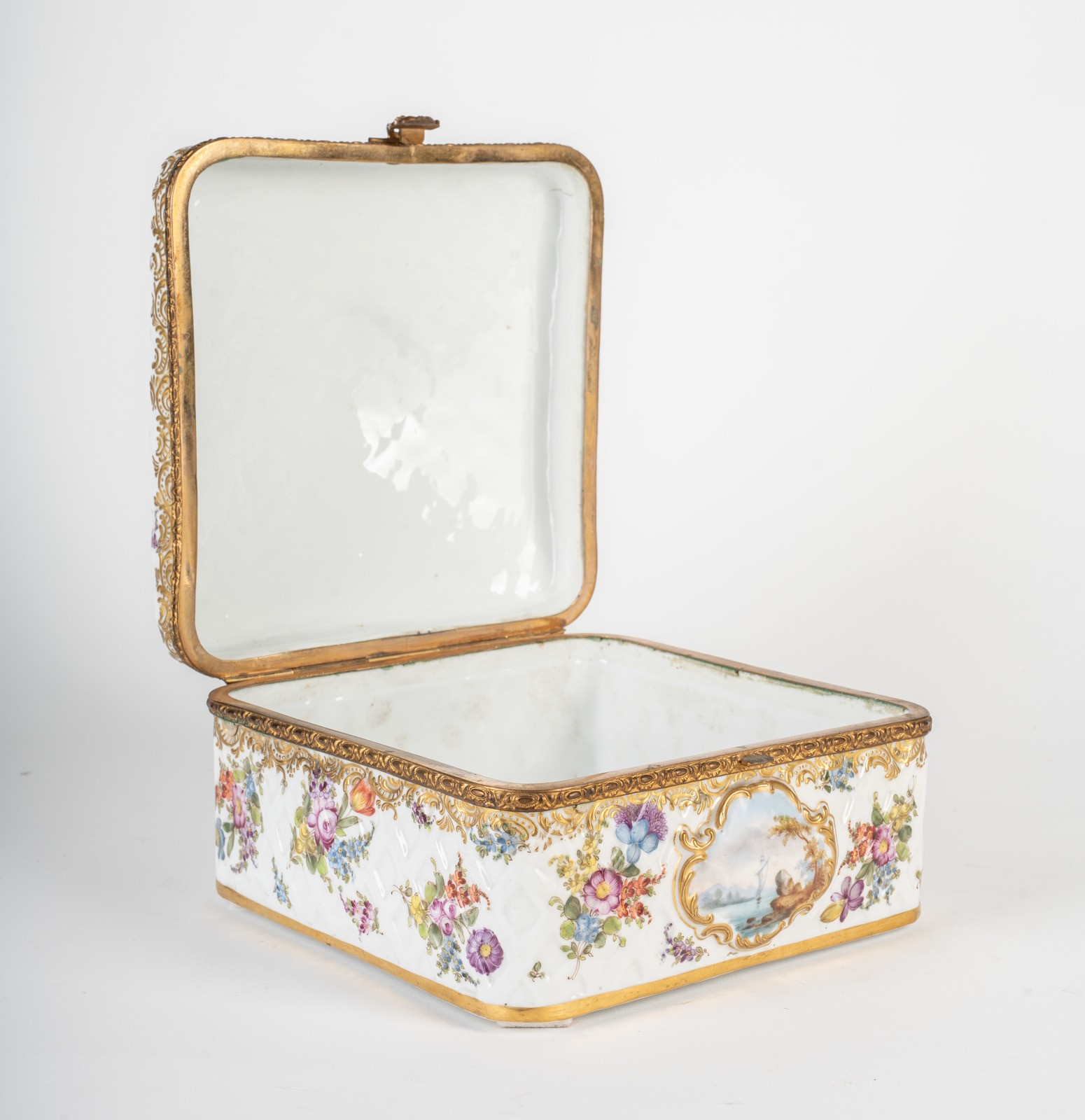 MANIFATTURA DI MEISSEN DEL XIX SECOLO Cofanetto in porcellana dipinta a fiori e figure in un paesaggio. . Cm 20,50 x 12,00 x 20,50. Marca: spade blu, finiture in bronzo dorato. Perfette condizioni.