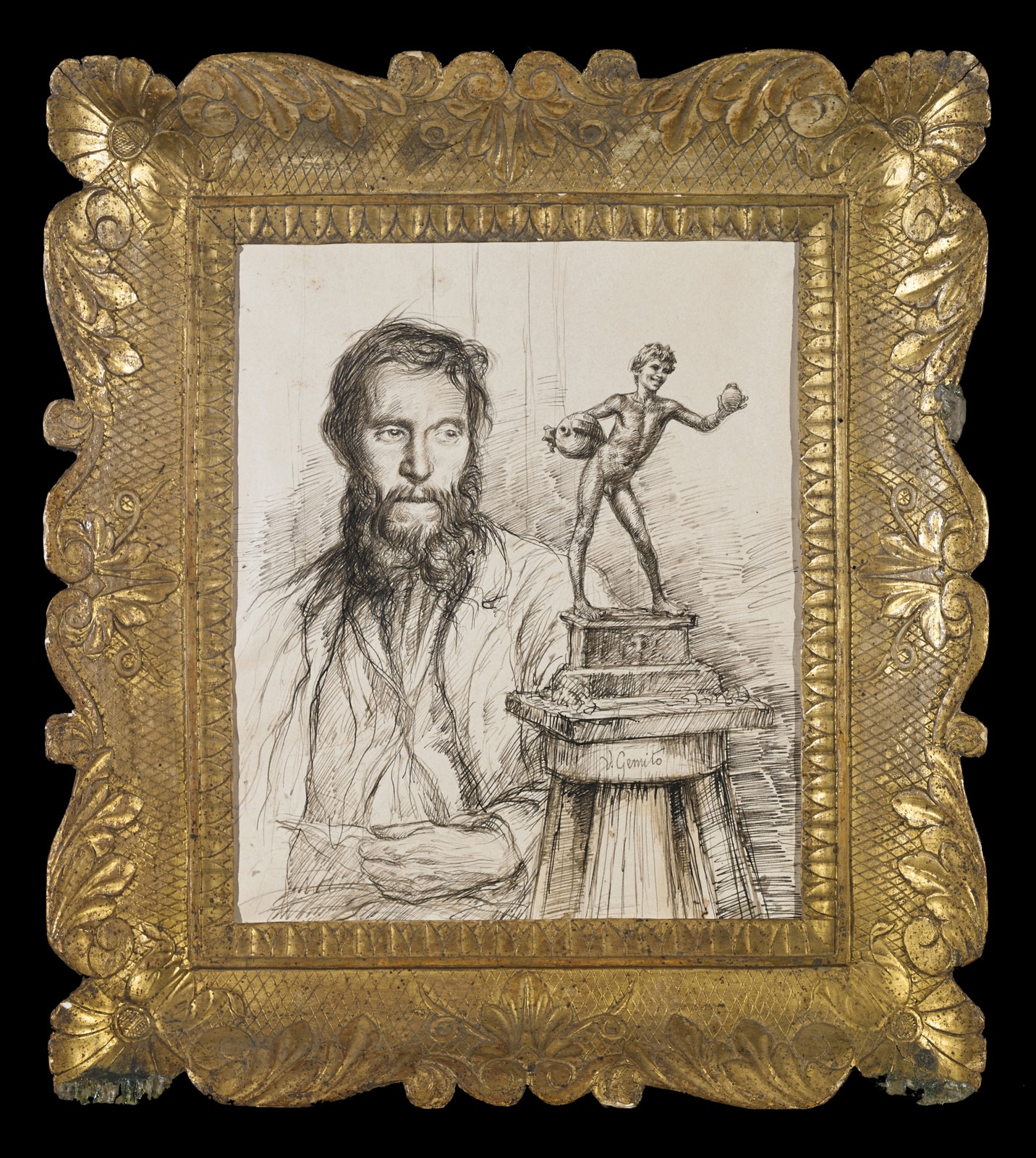 GEMITO VINCENZO (1852 - 1929) Autoritratto con l'acquaiolo. China su carta. Cm 28,00 x 33,00. Firmato in basso a destra a matita. . Cornice presente