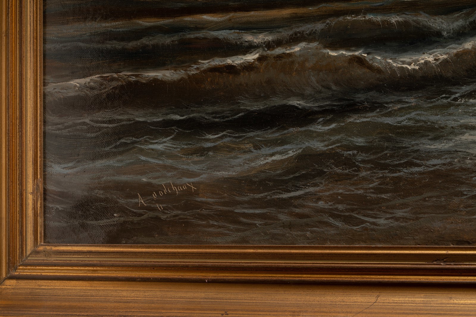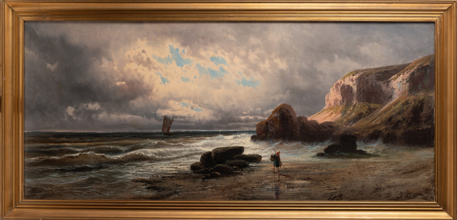 AMUS EUGENIO (1834 - 1899) Mareggiata bretone. . Olio su tela . Cm 116,00 x 52,00. Tracce di firma in basso a sinistra, A. Godchaux. . Cornice presente