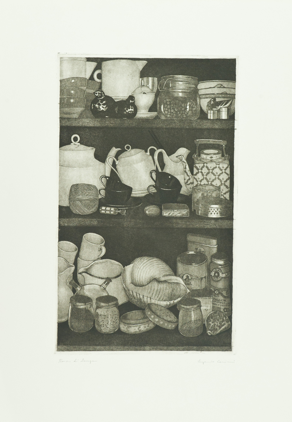 Eugenio Cecioni Dispensa Acquaforte di cm. 49x30, su carta di cm. 70x50, es. P.A. Firmato in basso a destra.