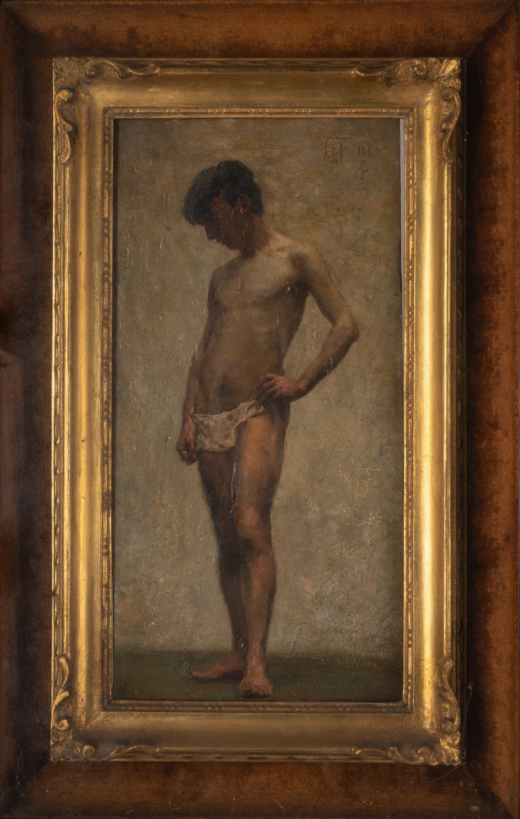 FAVRETTO GIACOMO (1849 - 1887) Nudo virile. Olio su tavola. Cm 17,00 x 33,00. Firmato e datato 1868 in alto a destra. Cornice presente